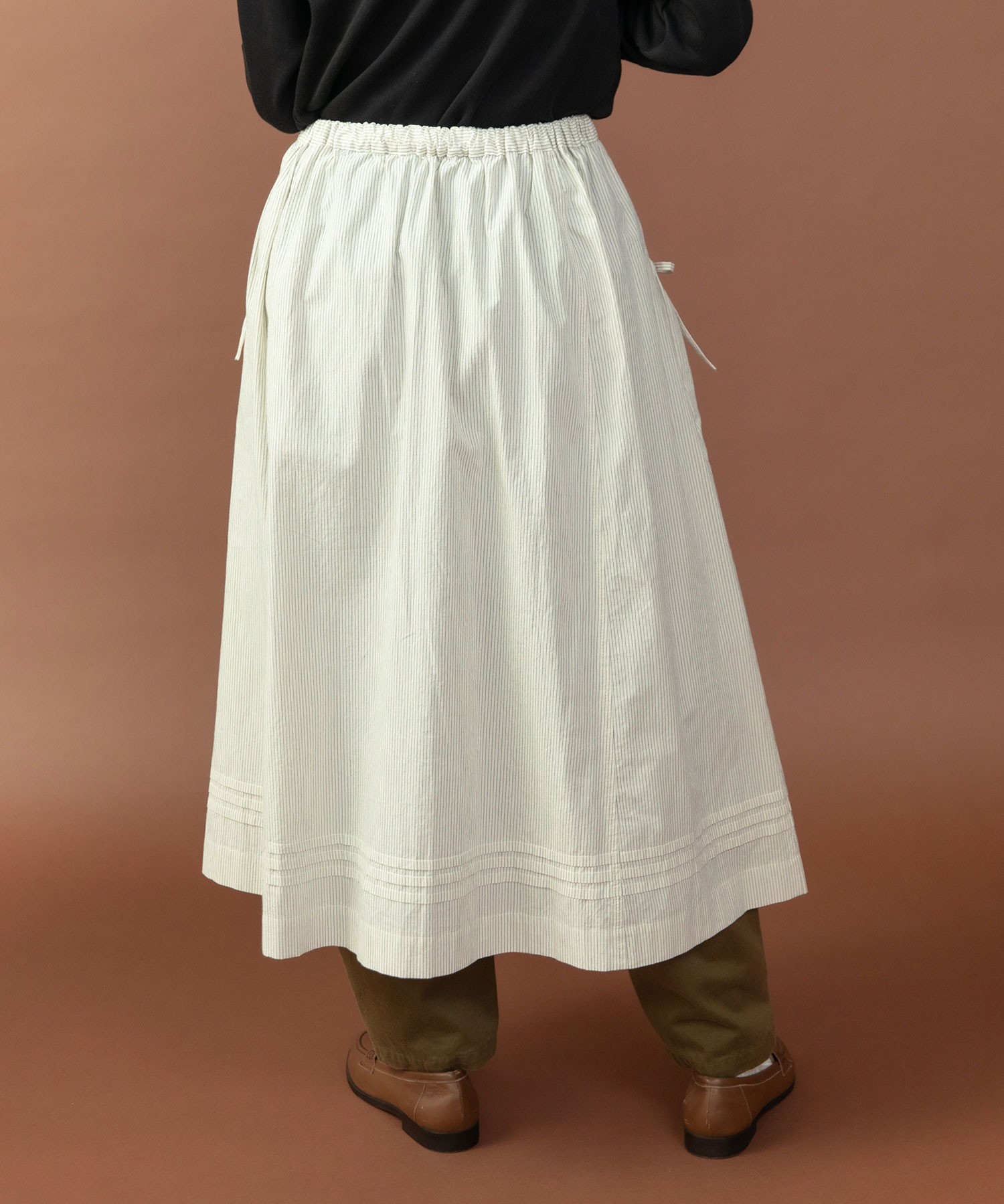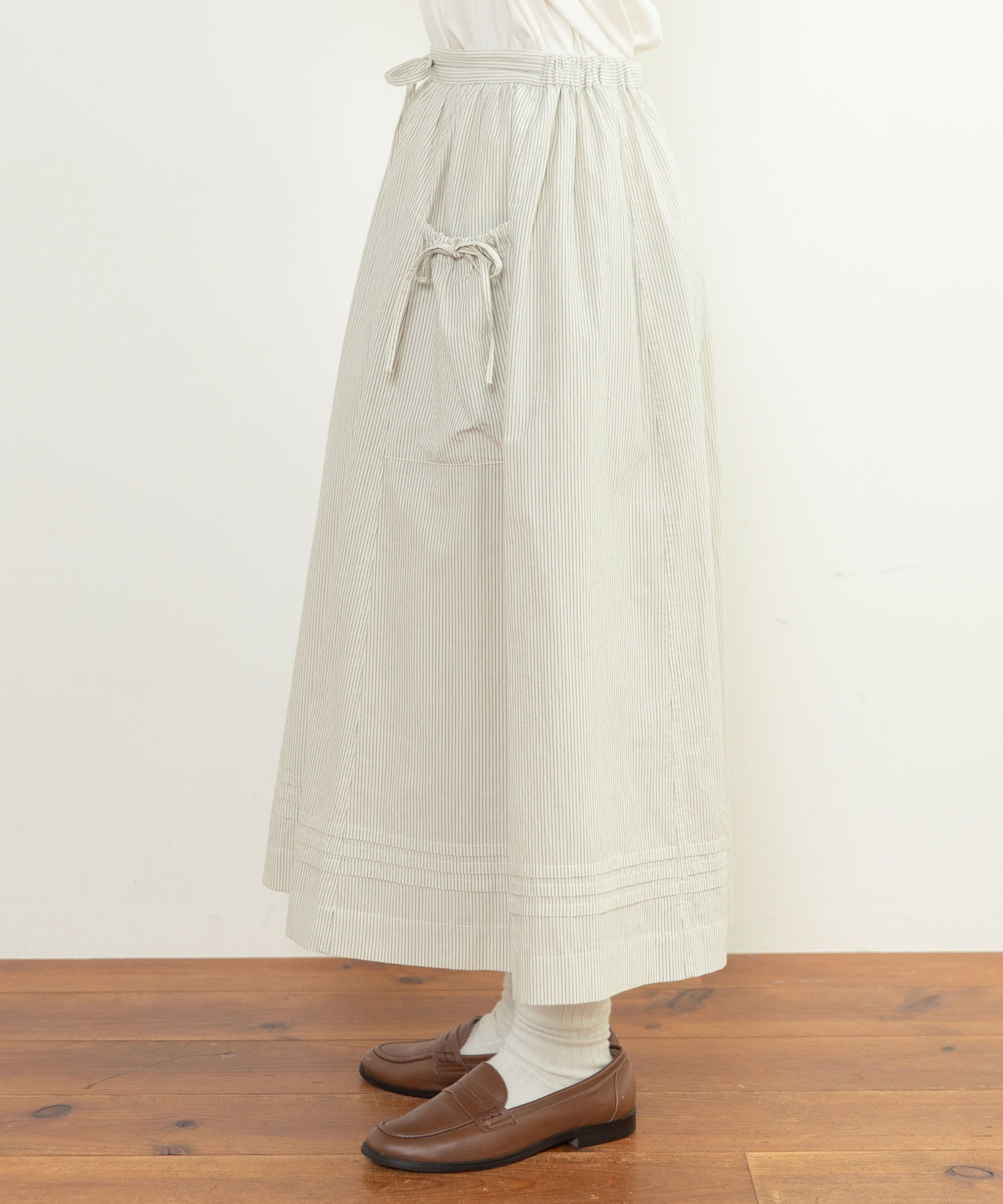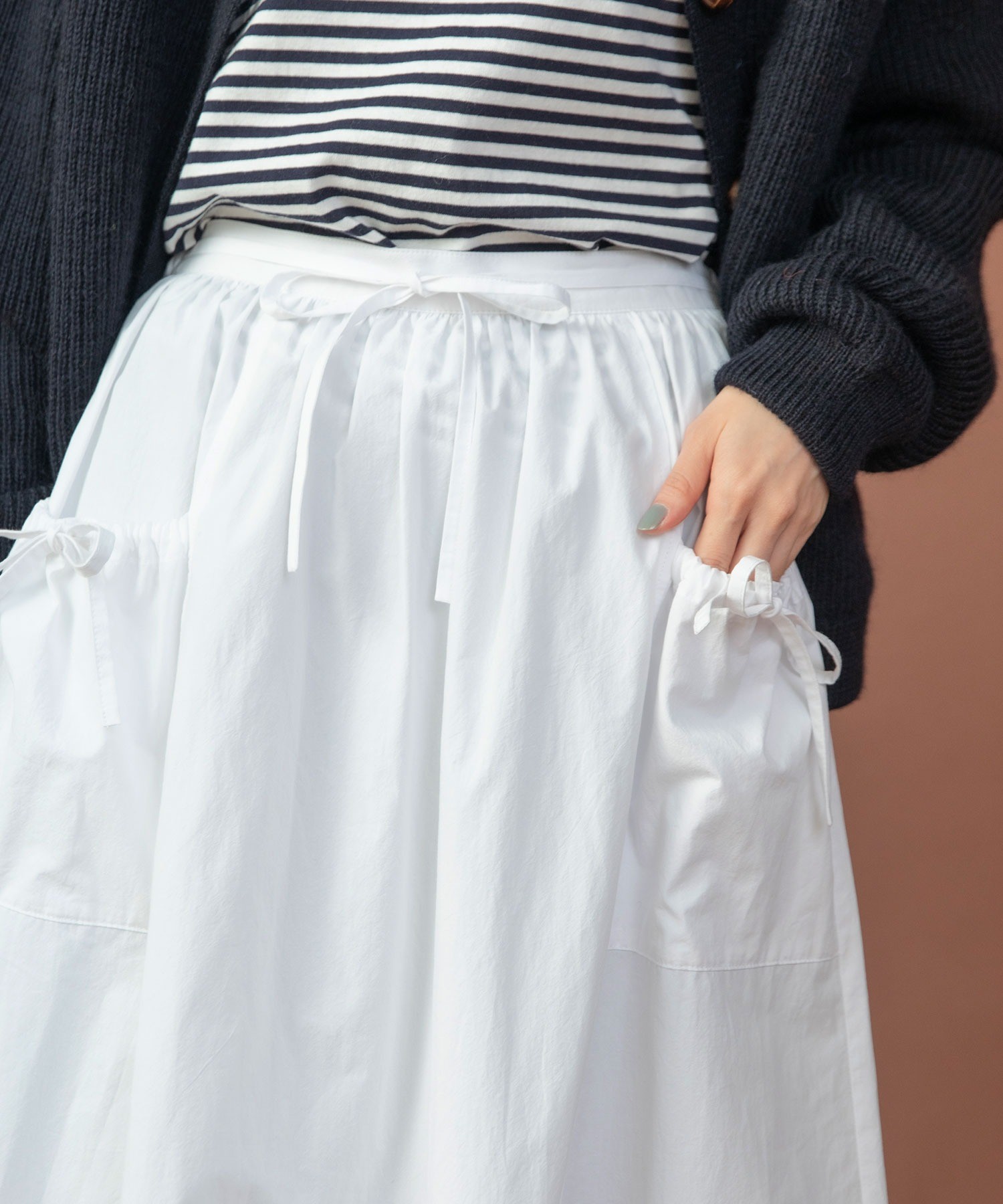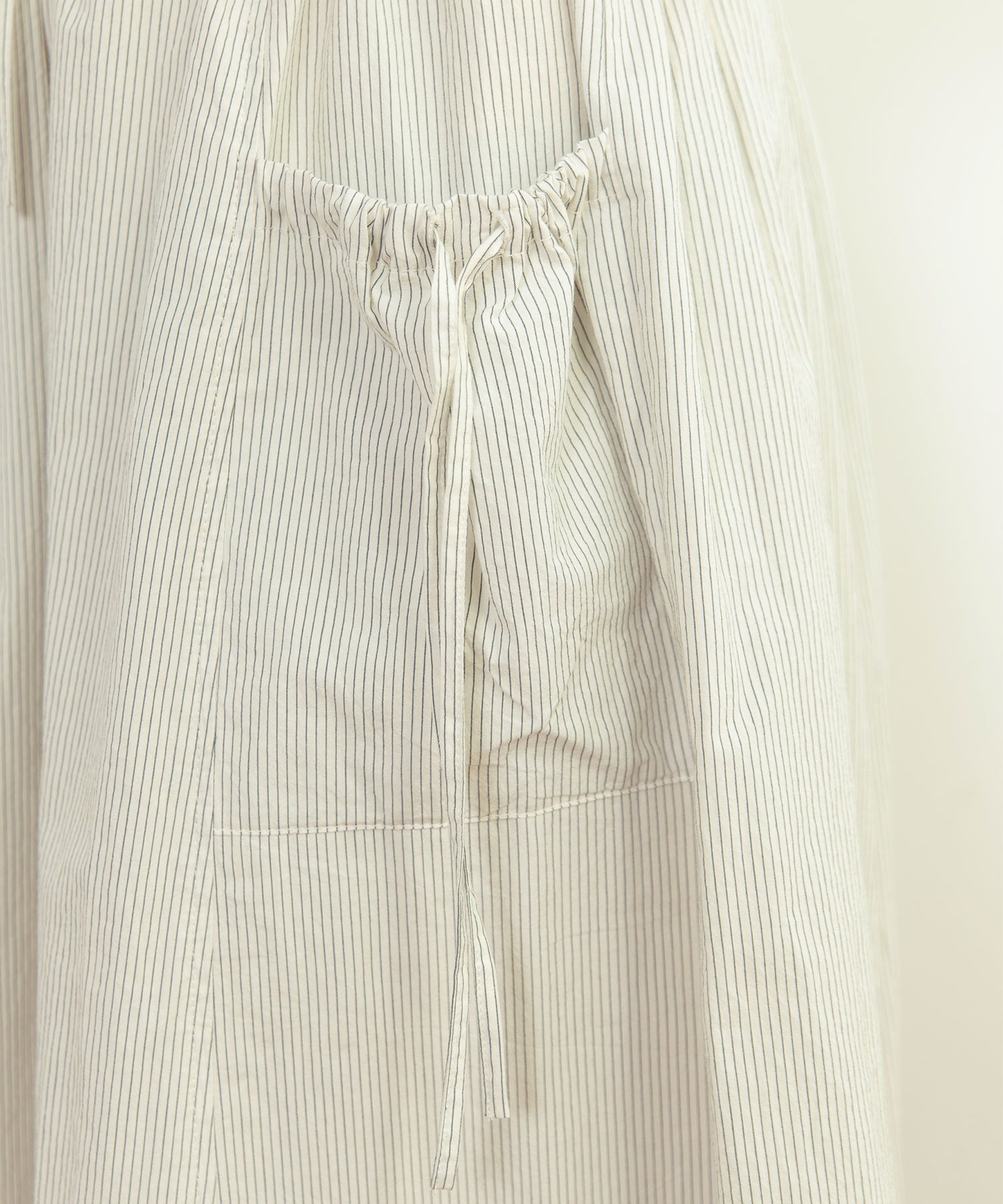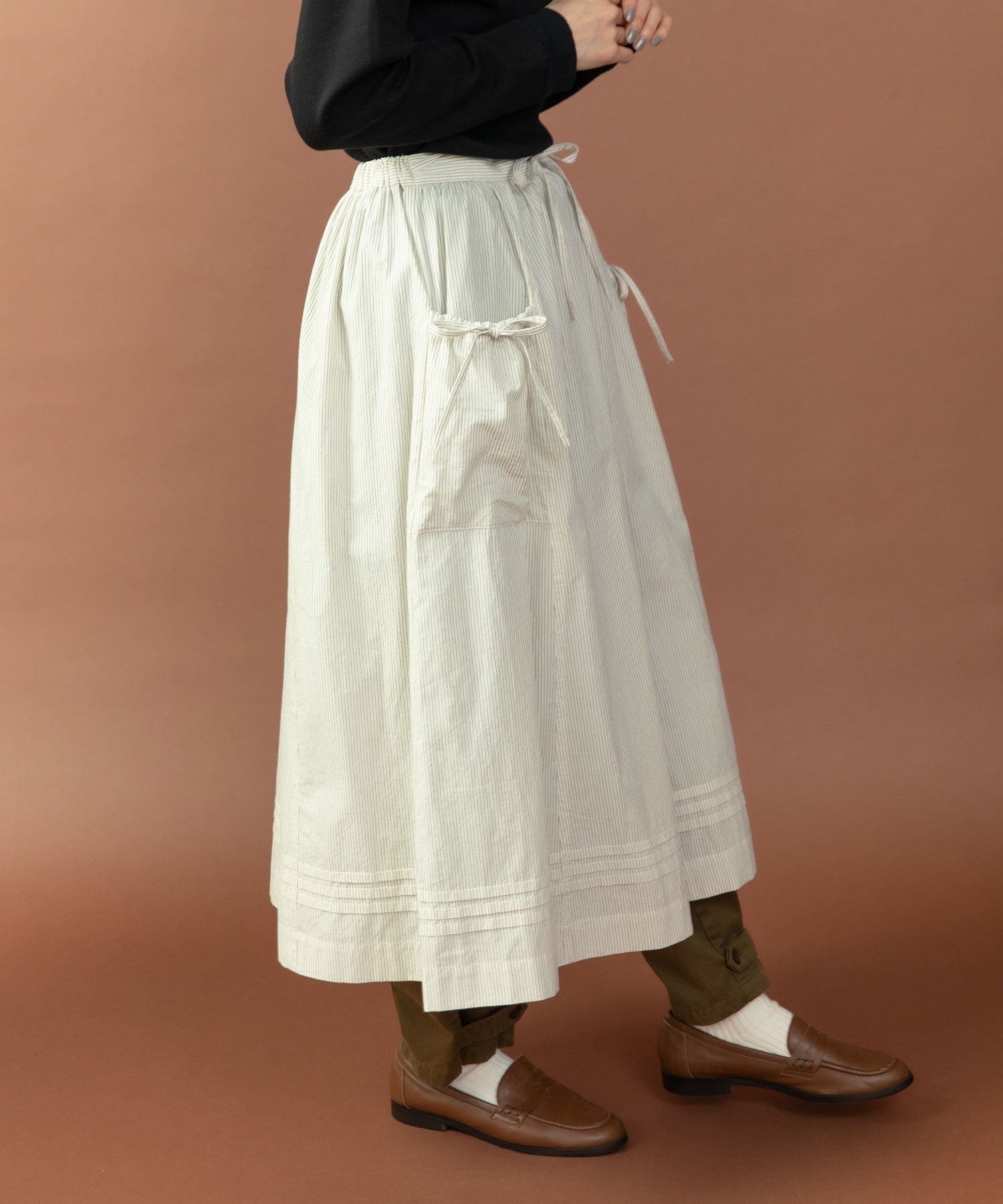 重ね履きしたボトムが覗く絶妙な着丈とボリュームで、シンプルなスタイリングに取り入れるだけで奥行きのある着こなしに。ウエストリボンはフロントやバックで結んでエプロンのように着たり、サイドポケットのリボンはあえて結ばすに垂らしてもリラックスした抜け感が出ます。リボンの結び具合によってシルエットの変わるポケットのギャザーや裾のピンタックなど、ほのかにかわいらしいディテールをメンズライクなアイテムに合わせるバランスがおすすめ。デニムやカーゴパンツを合わせれば、ちょうど良い甘さ加減のカジュアルスタイルが完成します。