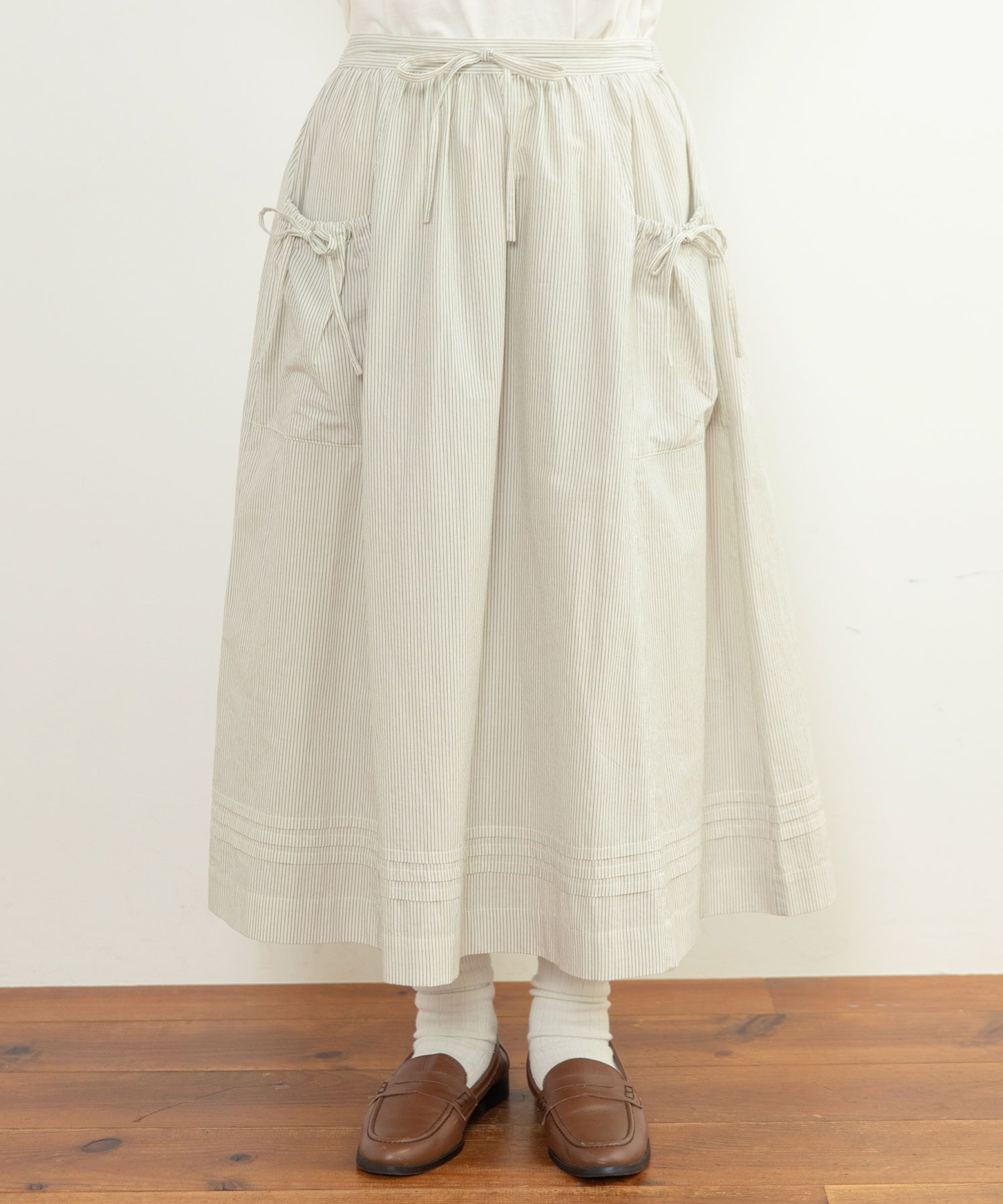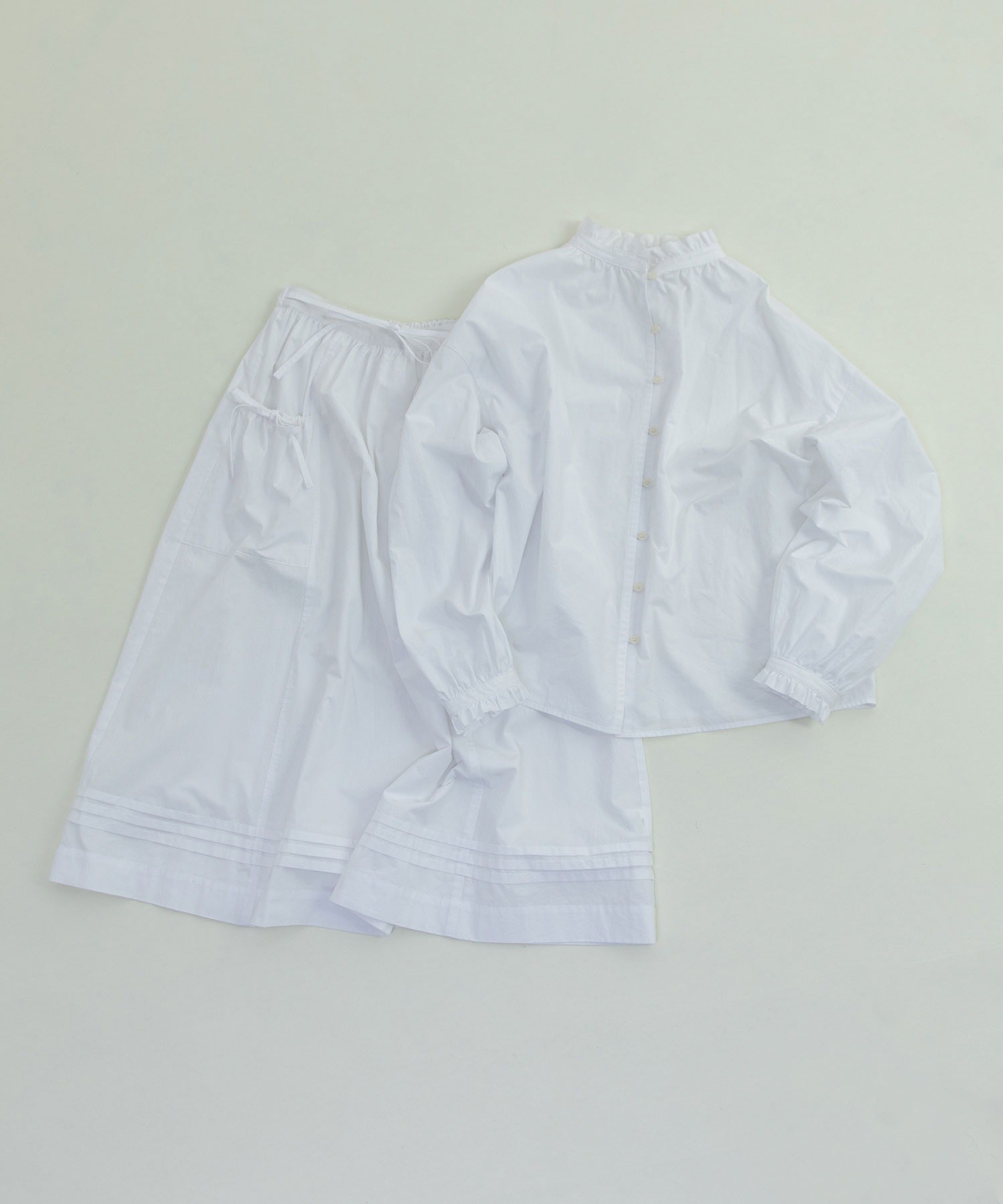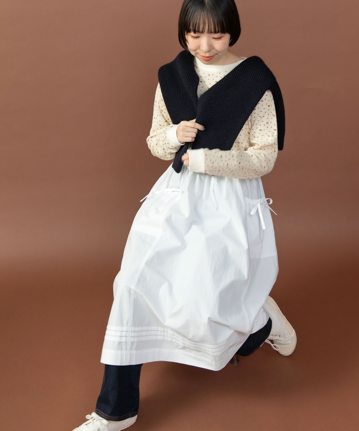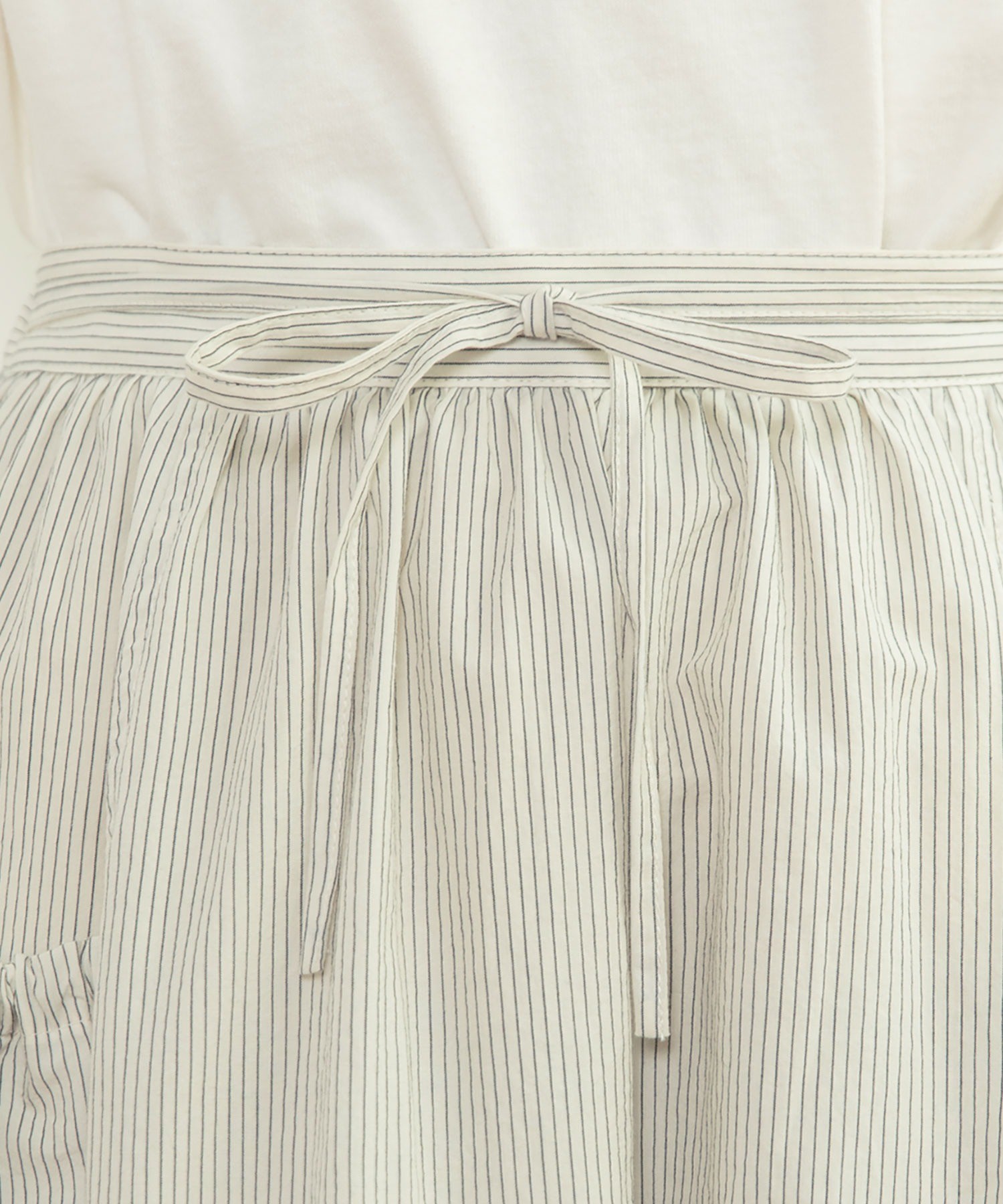 重ね履きしたボトムが覗く絶妙な着丈とボリュームで、シンプルなスタイリングに取り入れるだけで奥行きのある着こなしに。ウエストリボンはフロントやバックで結んでエプロンのように着たり、サイドポケットのリボンはあえて結ばすに垂らしてもリラックスした抜け感が出ます。リボンの結び具合によってシルエットの変わるポケットのギャザーや裾のピンタックなど、ほのかにかわいらしいディテールをメンズライクなアイテムに合わせるバランスがおすすめ。デニムやカーゴパンツを合わせれば、ちょうど良い甘さ加減のカジュアルスタイルが完成します。