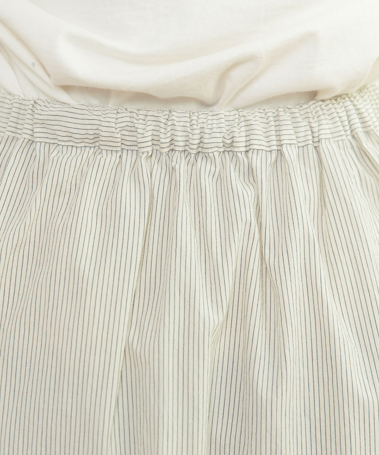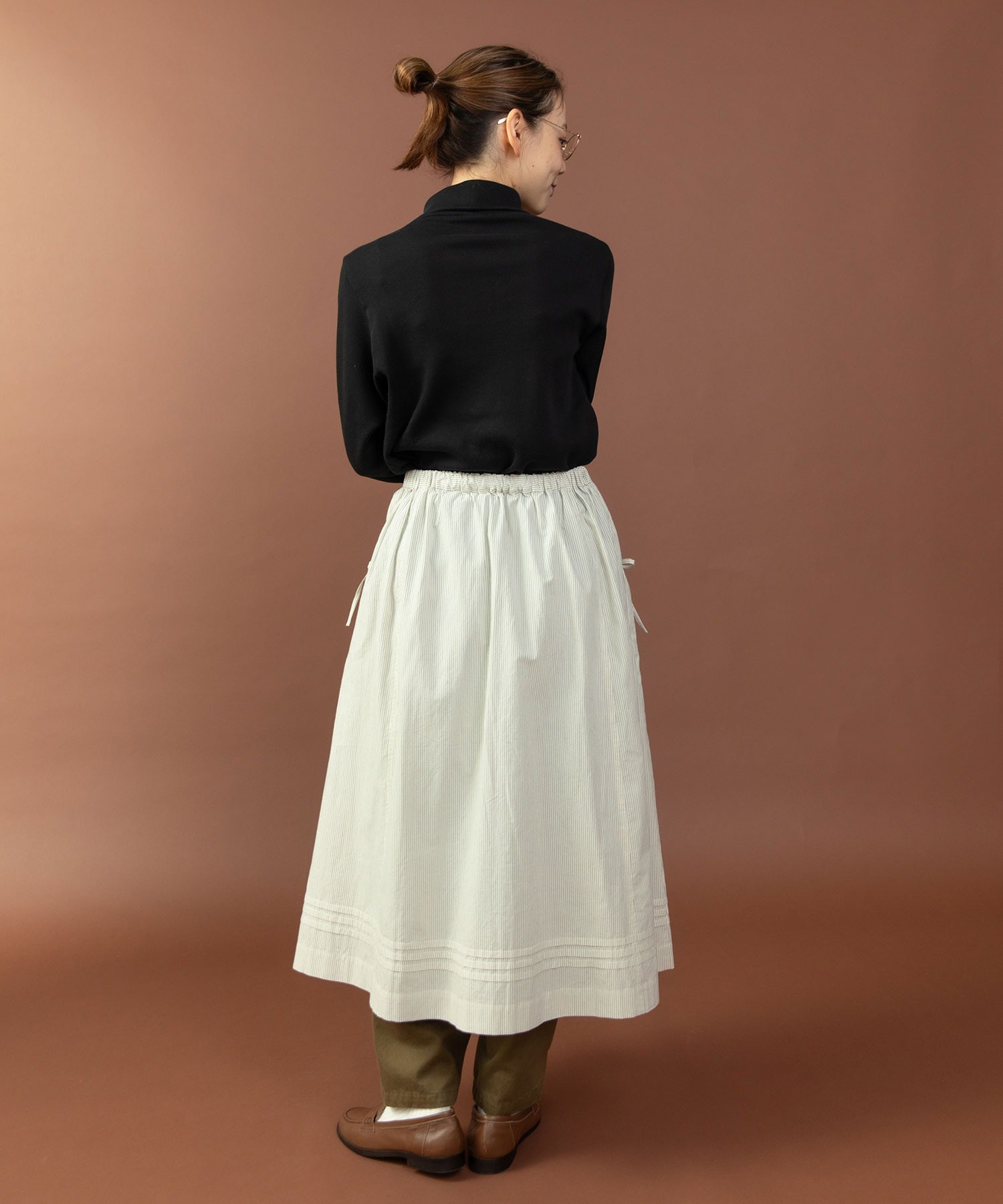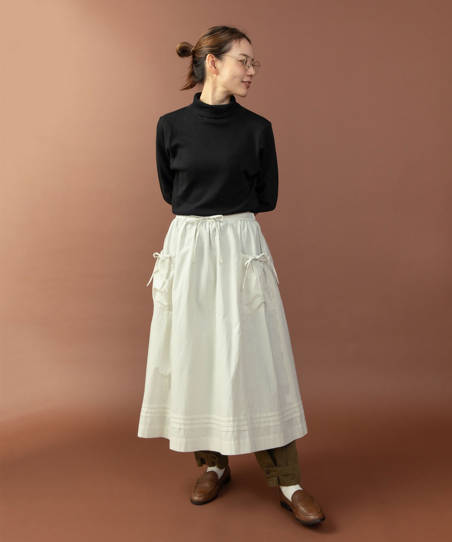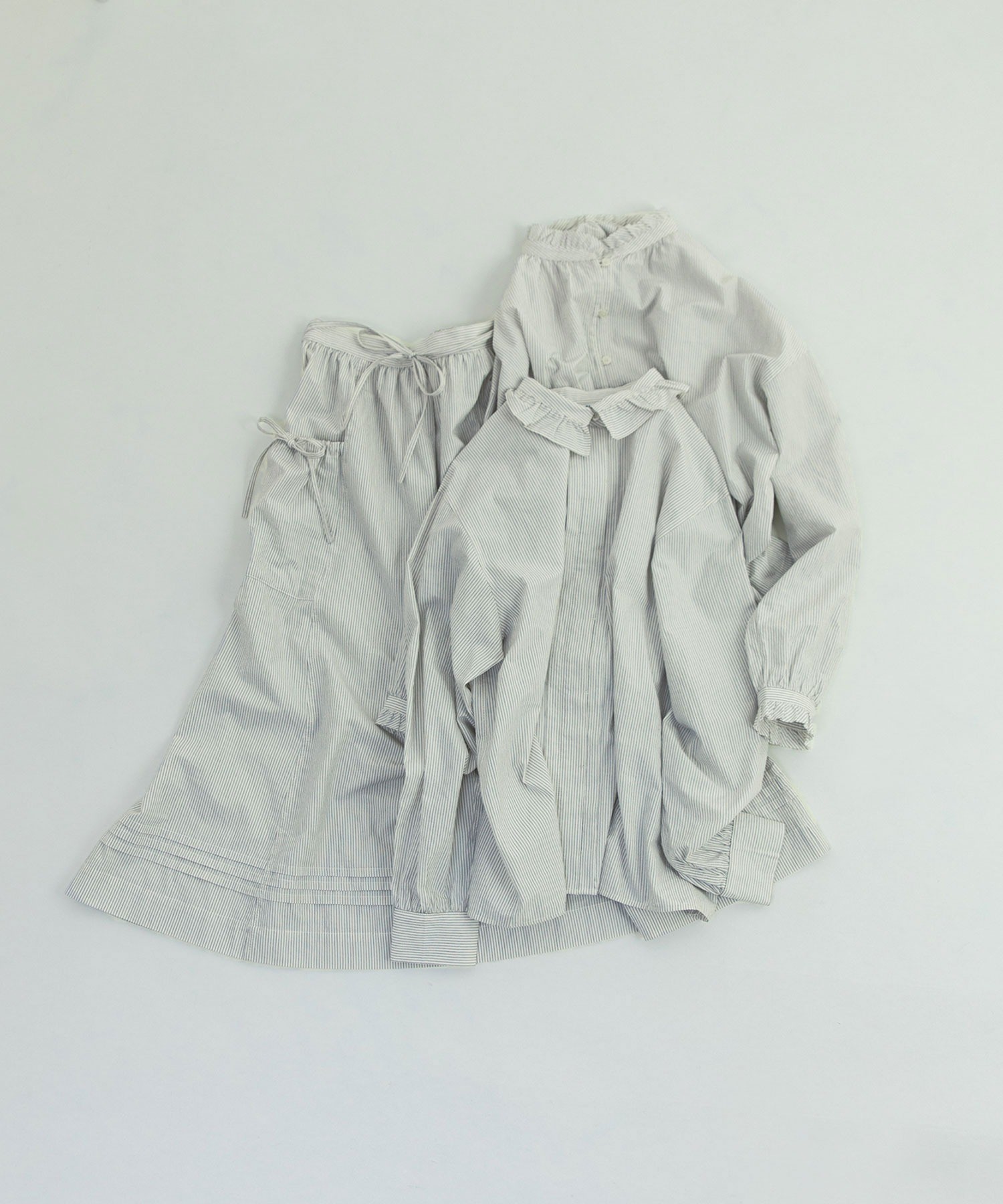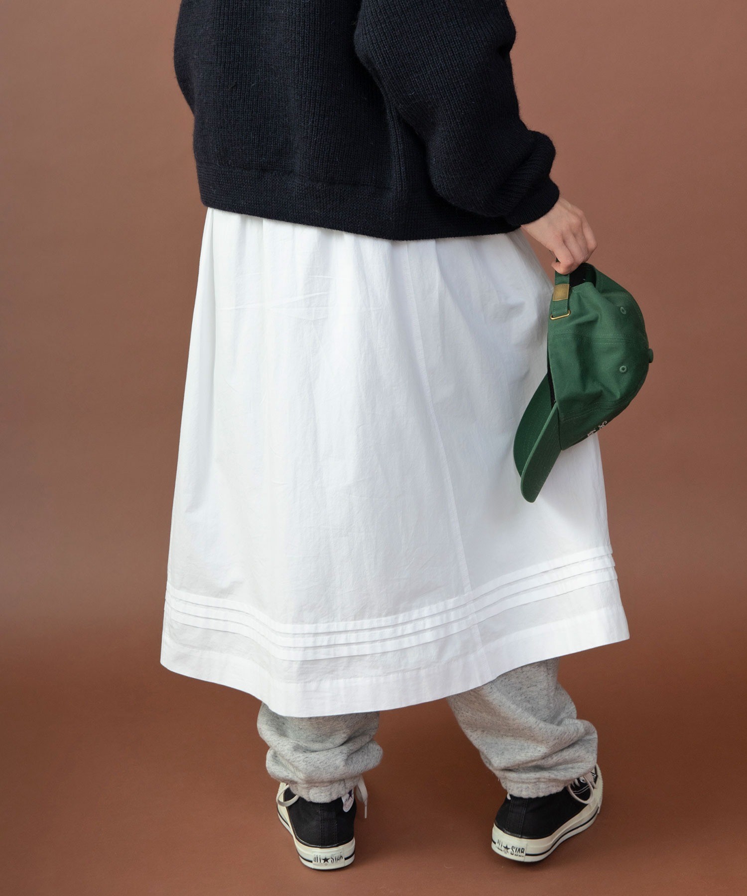 重ね履きしたボトムが覗く絶妙な着丈とボリュームで、シンプルなスタイリングに取り入れるだけで奥行きのある着こなしに。ウエストリボンはフロントやバックで結んでエプロンのように着たり、サイドポケットのリボンはあえて結ばすに垂らしてもリラックスした抜け感が出ます。リボンの結び具合によってシルエットの変わるポケットのギャザーや裾のピンタックなど、ほのかにかわいらしいディテールをメンズライクなアイテムに合わせるバランスがおすすめ。デニムやカーゴパンツを合わせれば、ちょうど良い甘さ加減のカジュアルスタイルが完成します。