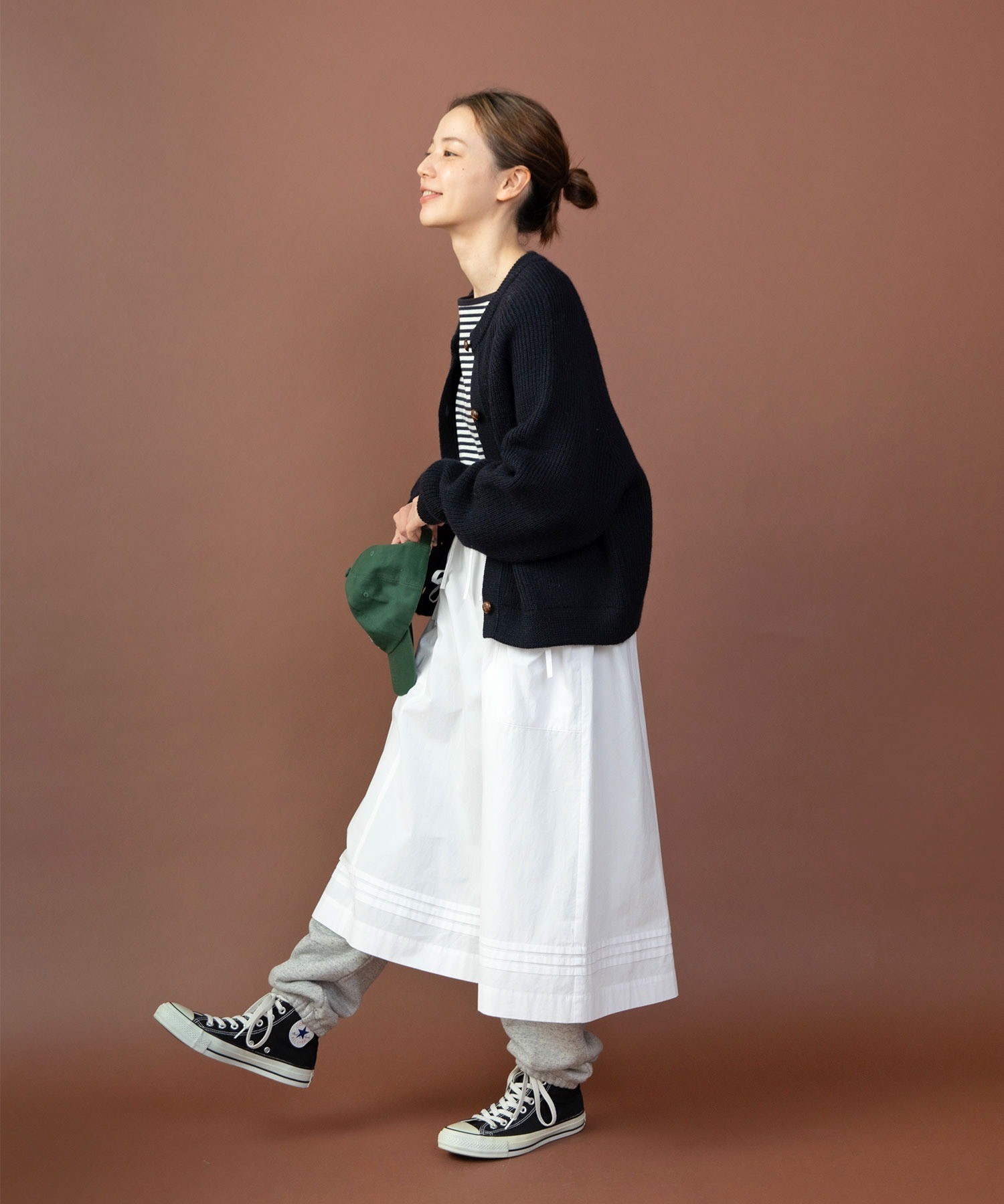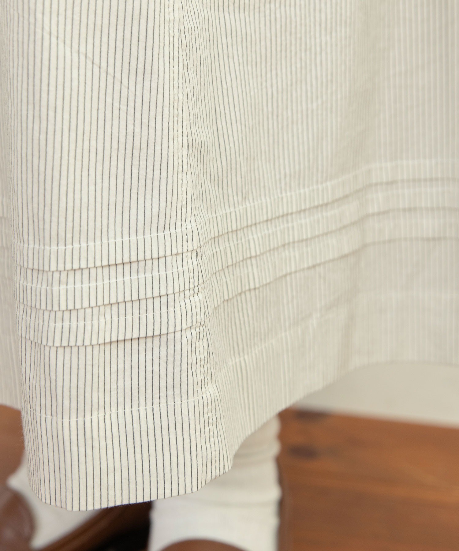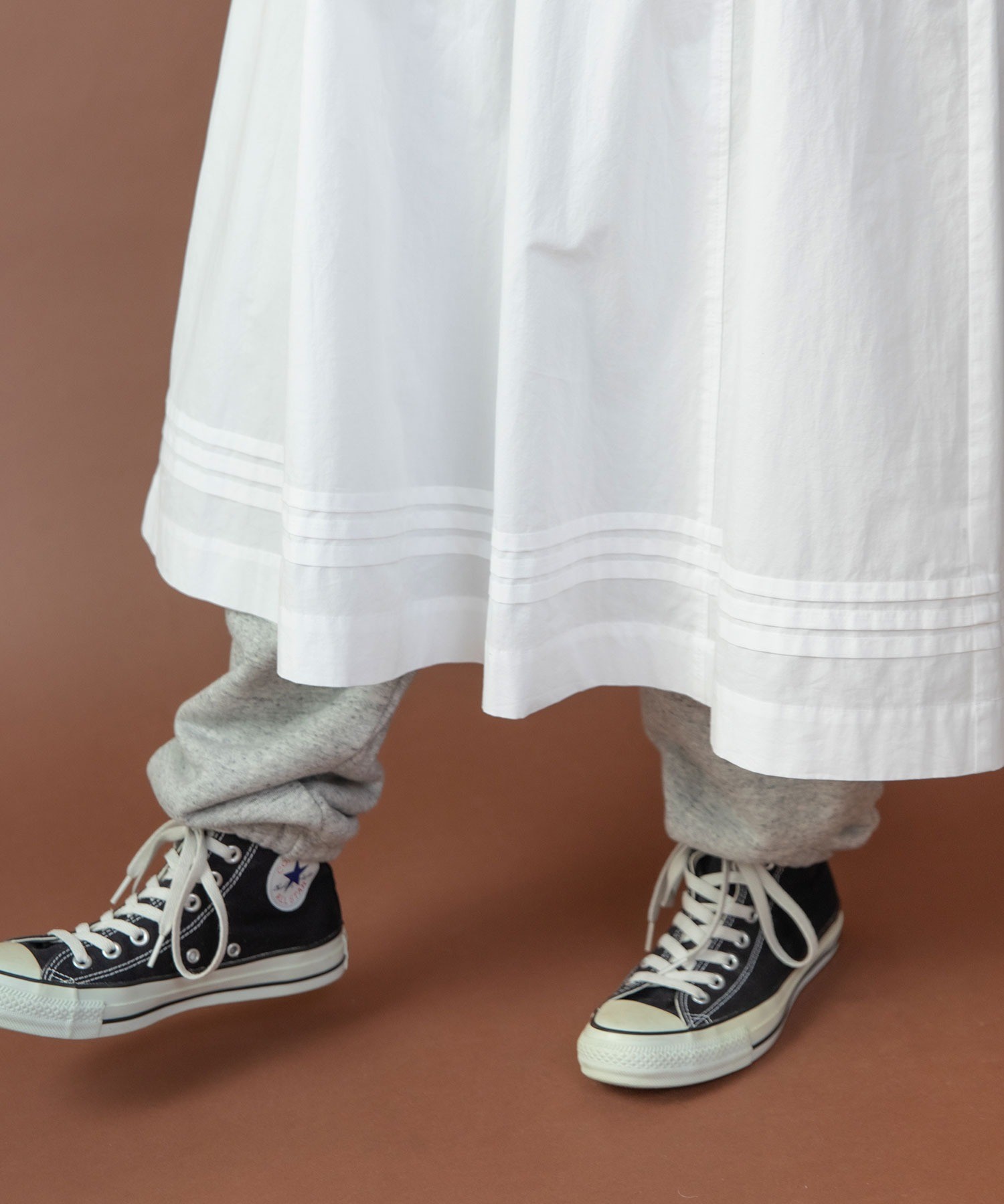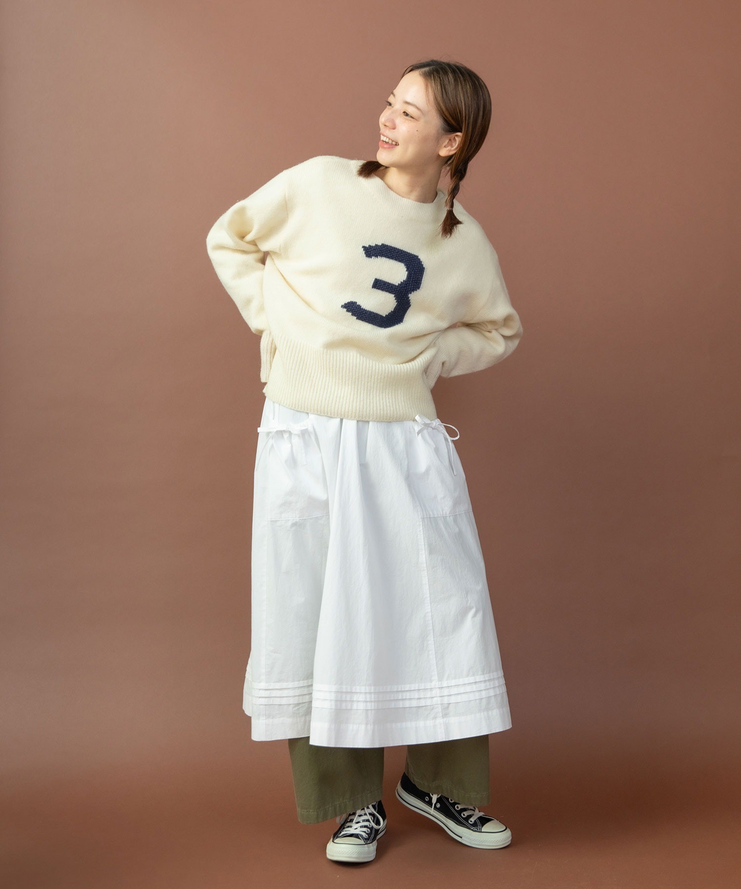 重ね履きしたボトムが覗く絶妙な着丈とボリュームで、シンプルなスタイリングに取り入れるだけで奥行きのある着こなしに。ウエストリボンはフロントやバックで結んでエプロンのように着たり、サイドポケットのリボンはあえて結ばすに垂らしてもリラックスした抜け感が出ます。リボンの結び具合によってシルエットの変わるポケットのギャザーや裾のピンタックなど、ほのかにかわいらしいディテールをメンズライクなアイテムに合わせるバランスがおすすめ。デニムやカーゴパンツを合わせれば、ちょうど良い甘さ加減のカジュアルスタイルが完成します。