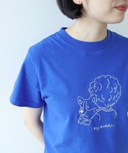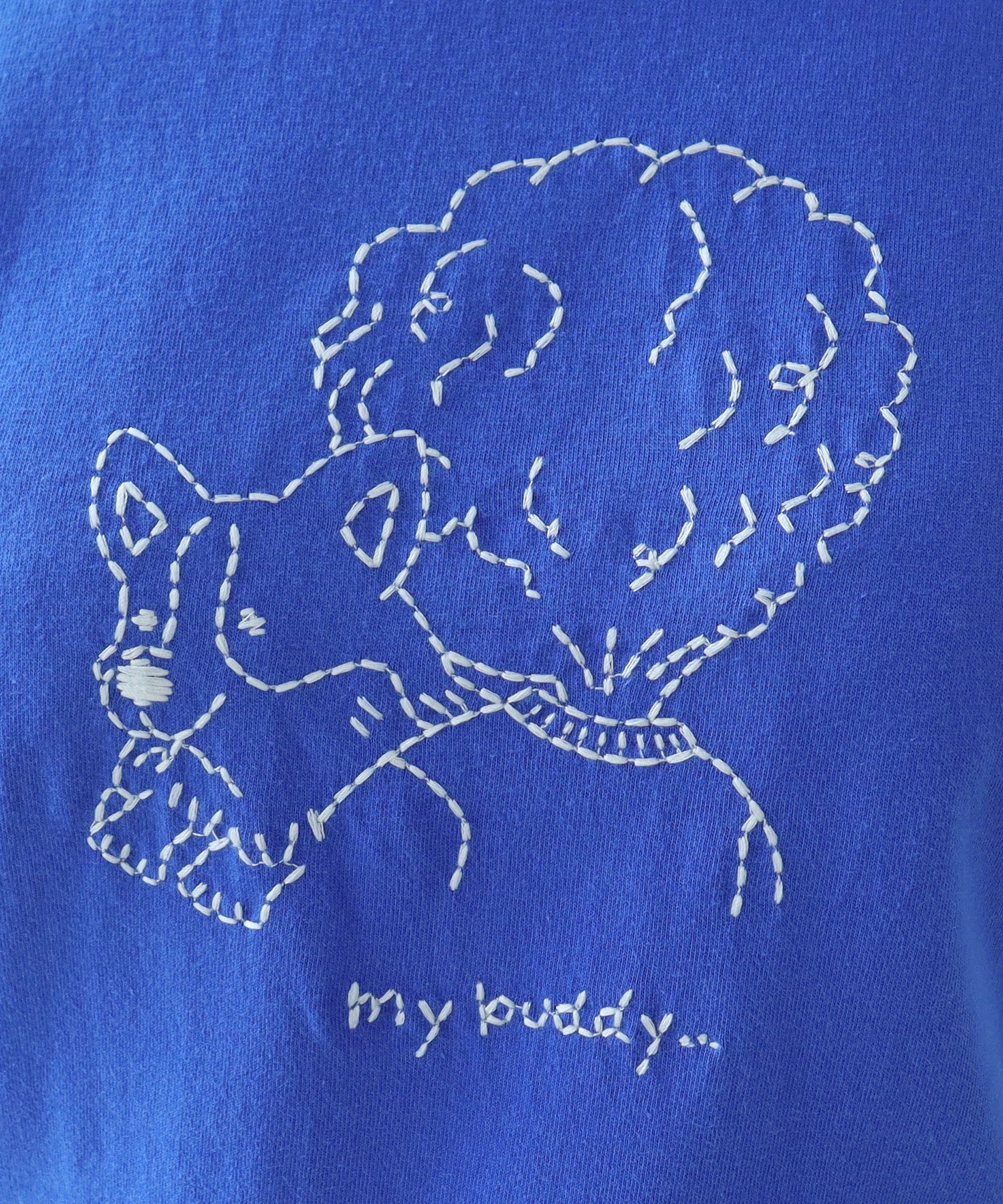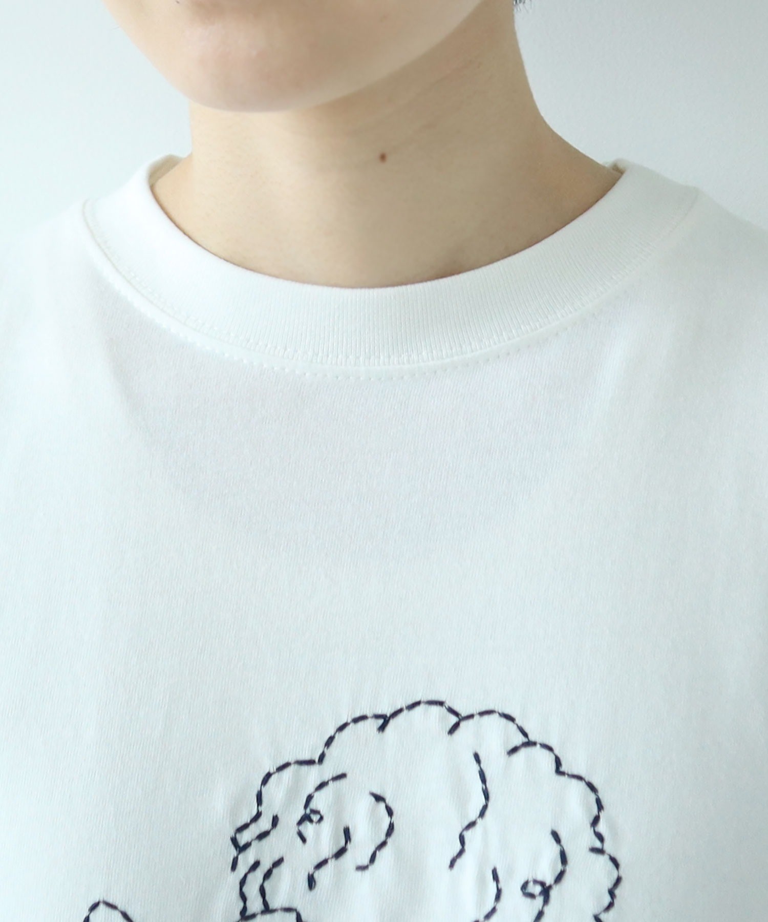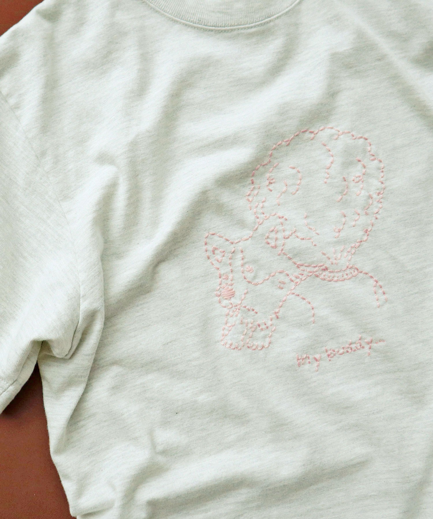 ざっくりとしたハンドメイド風の刺繍で、シロのボディにはコンでニュアンス感を、グレーにはなじみが良くさりげないピンクを、アオにはさわやかな印象のシロを刺繍糸で選びました。