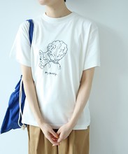 相棒のコーギーを抱っこしている男の子。たいせつに抱えられてぴょこんと飛び出したコーギーの様子がなんとも愛らしいTシャツです。