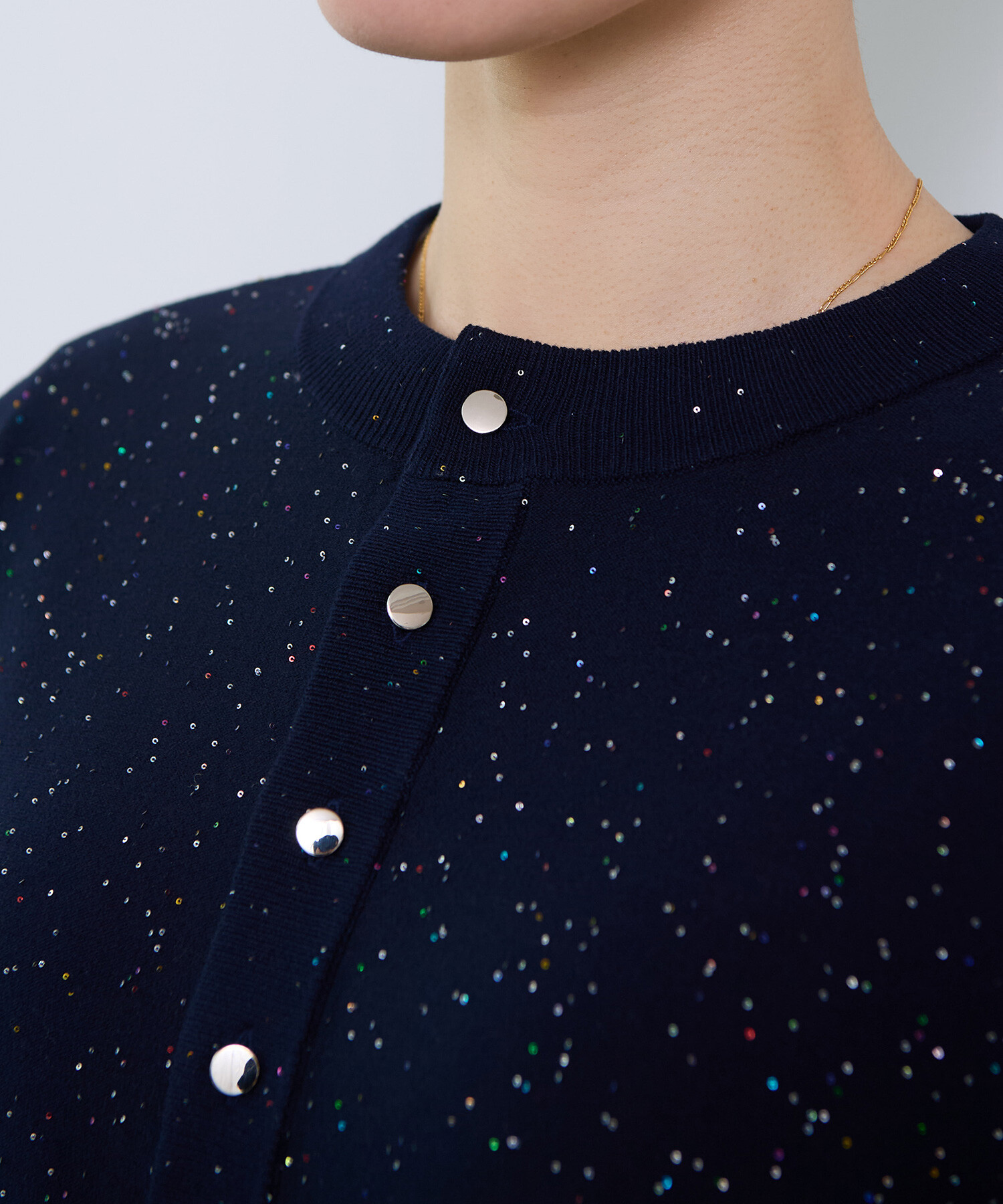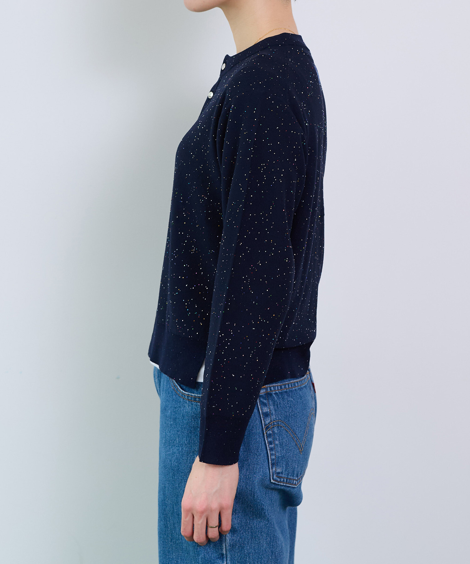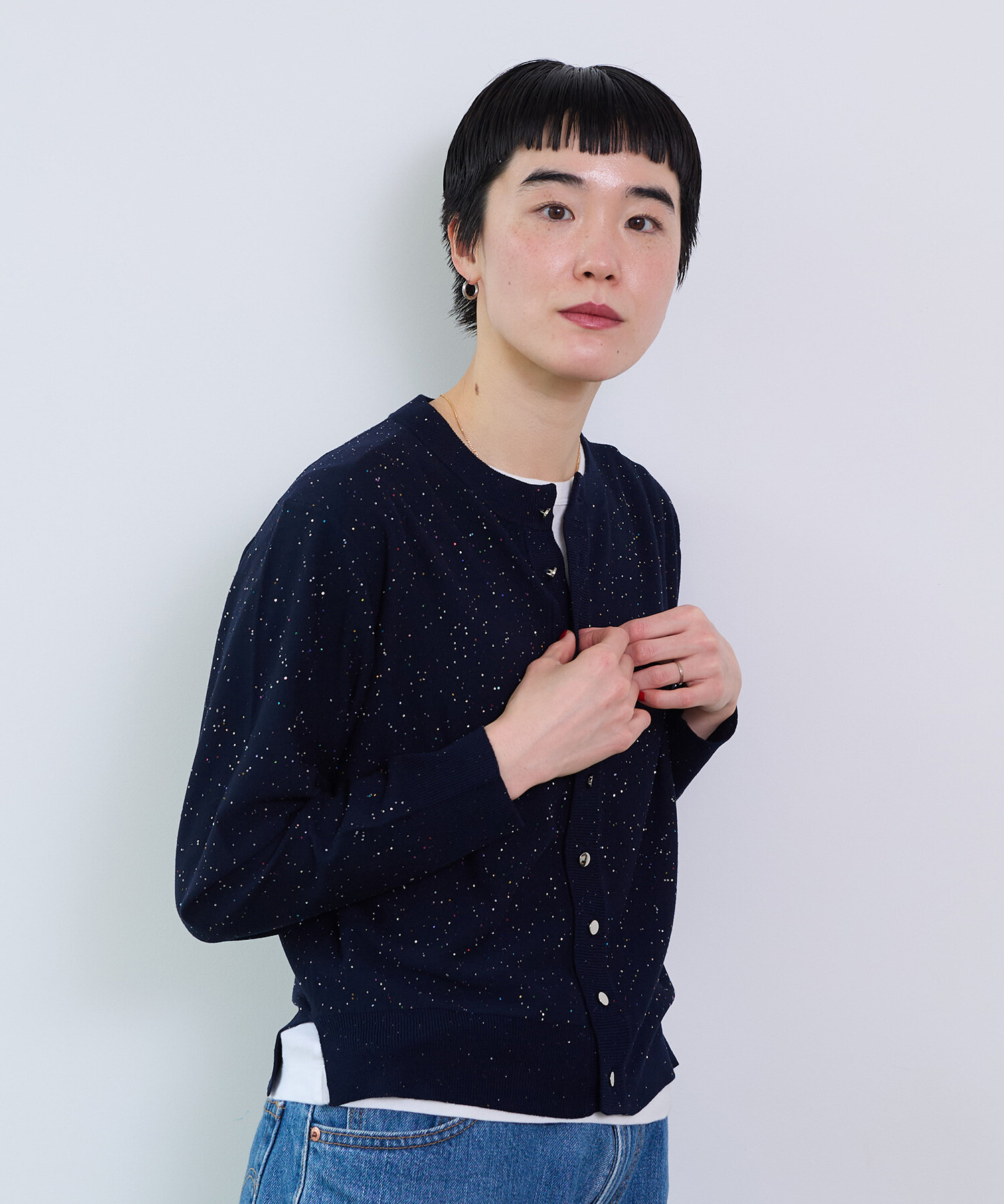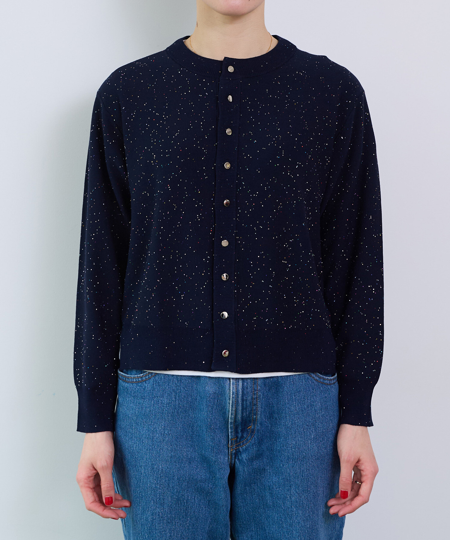 ※NAVYはサンプルです。 ※くるみ釦からシルバーのメタル釦に変更となります。 ----------------------- 透け感:なし 裏地:なし 伸縮性:あり 光沢感:あり ----------------------- 【素材の特性・お取り扱いの注意】 この製品は、スパンコールを使用しております。乱暴に扱いますと、破損致 しますので、丁寧に取り扱って下さい。又、強い摩擦等により、変色及び表面がはがれてしまう事がありますので御了承下さい。尚、スパンコール部分へのアイロンは、変形、変色す る場合がありますので絶対に避けて下さい。 この製品は、レーヨン素材を使用している為、水に濡れると強度が落ちます。水に濡れたり、ひっぱったりすると破れる恐れがありますので御注意下さい。 この製品を洗濯する際には多少縮む場合がありますので必ず裏返しにして押し洗いをする様にして下さい。又、形を整えてから日陰で平干ししてください。タンブラー乾燥はお避けください。また、着用しての過度な運動や荷重のかかりやすい動作は、素材が伸びやすくなる為、極力お避け下さい。