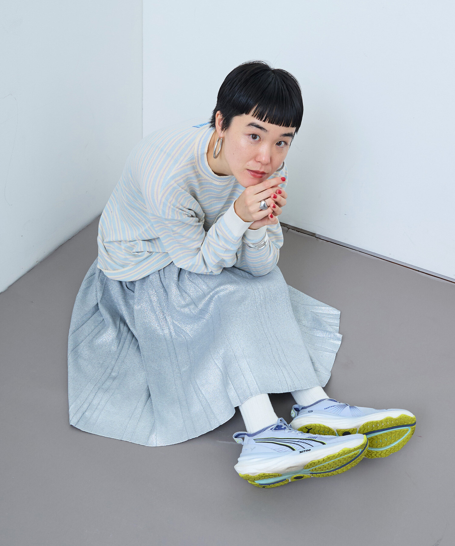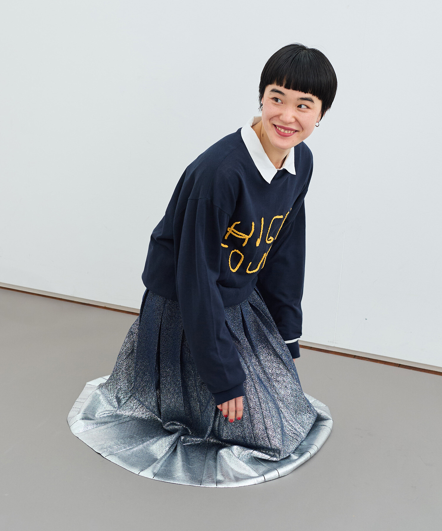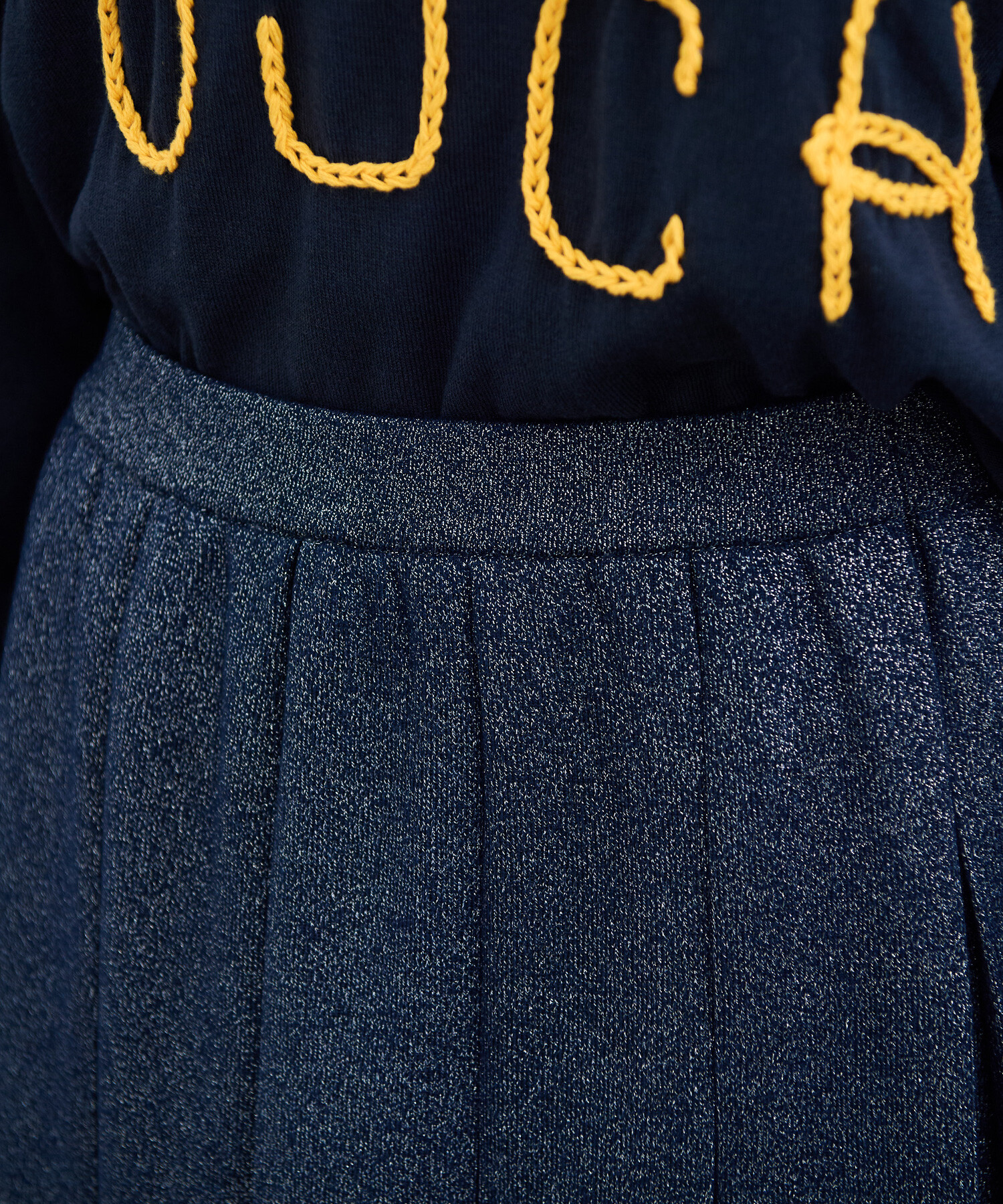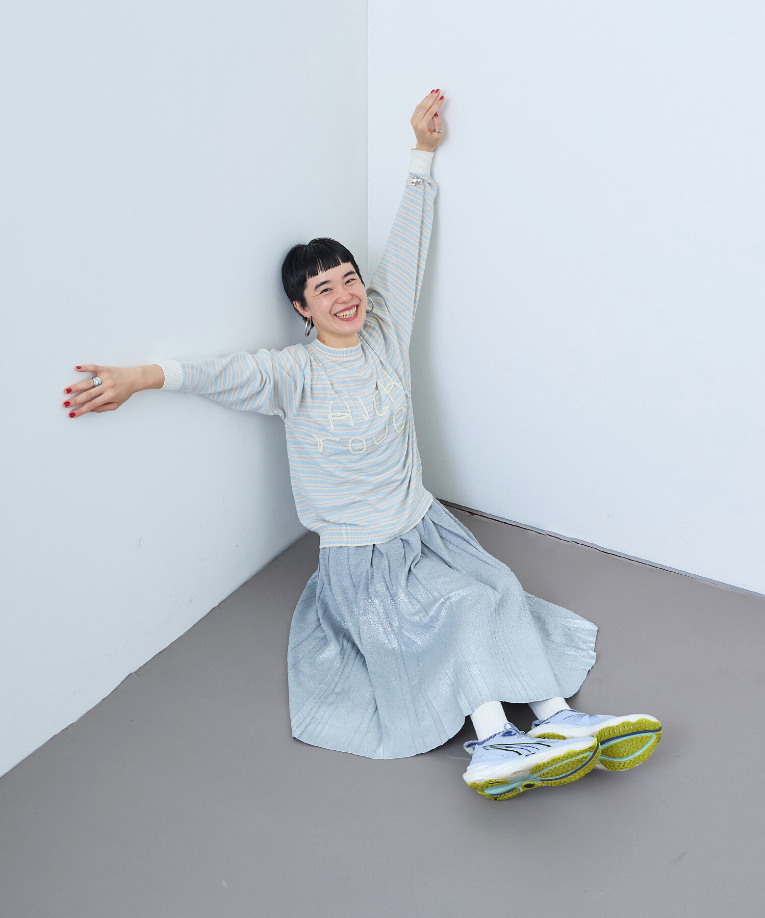 ボックスプリーツをニットで表現しました。