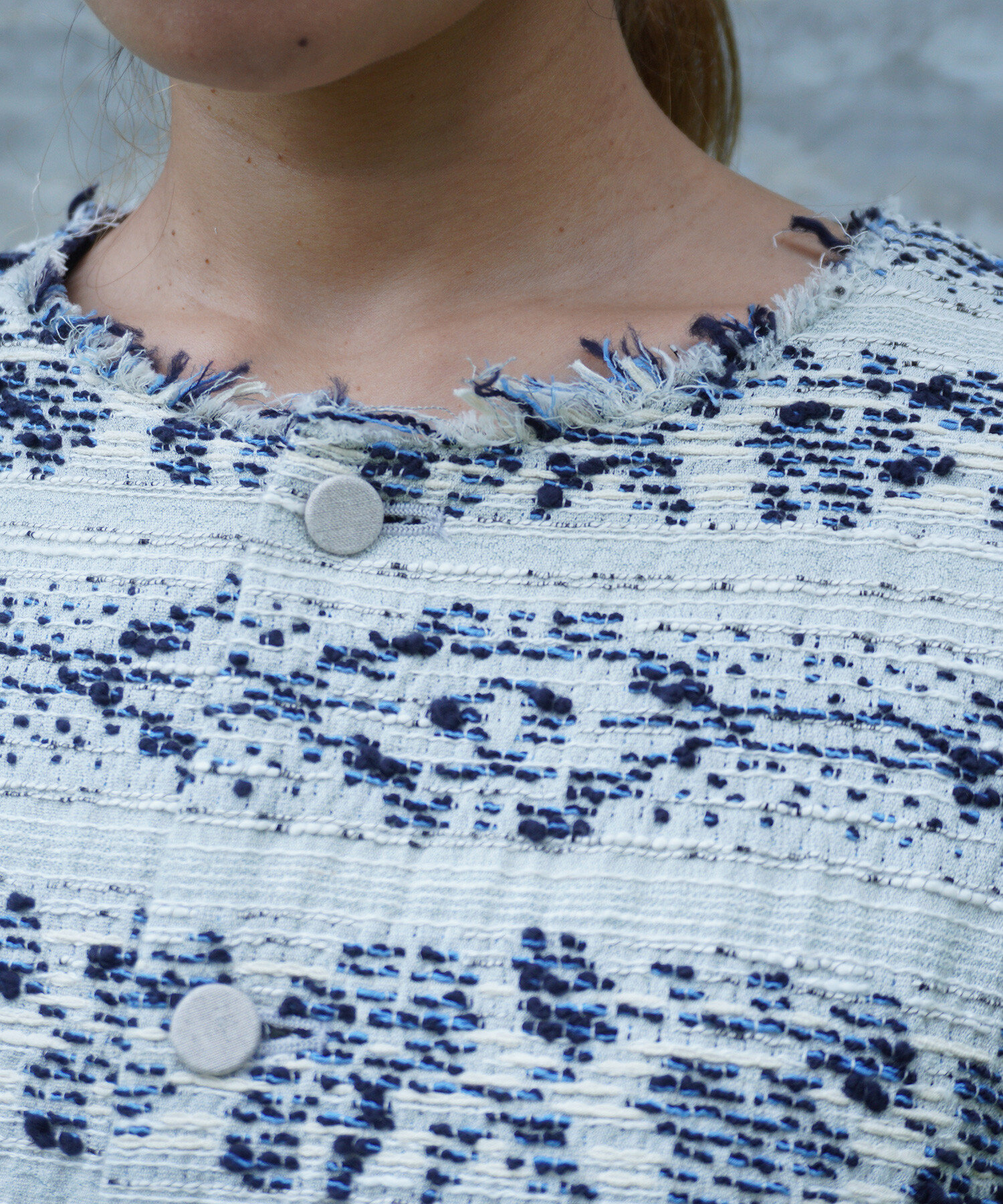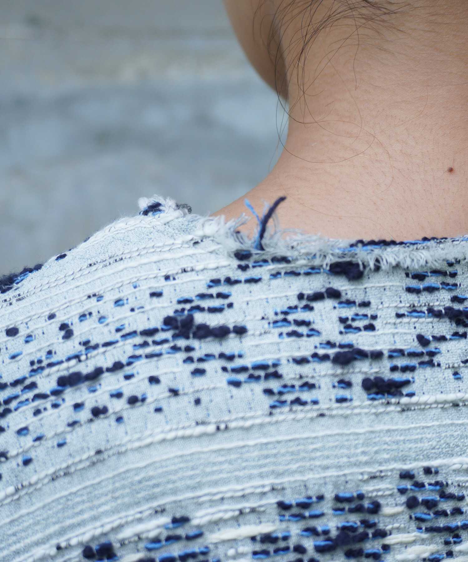 襟ぐりや袖ぐり等にフリンジを入れてアクセントにしています。