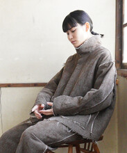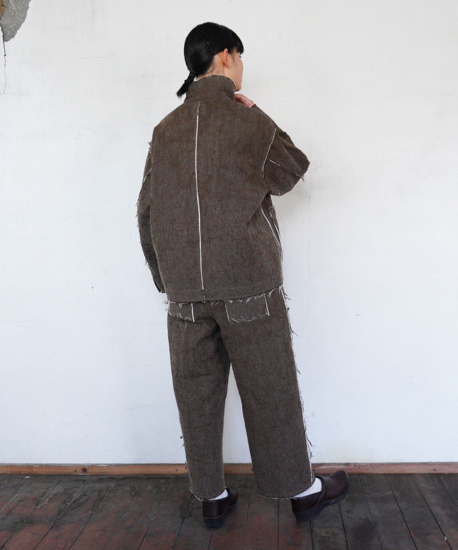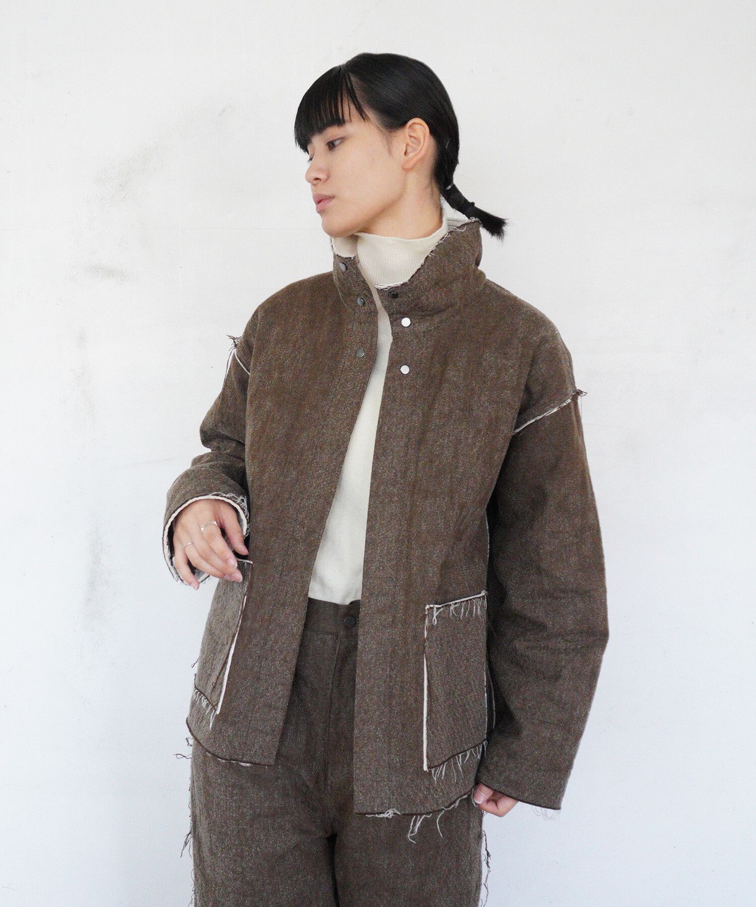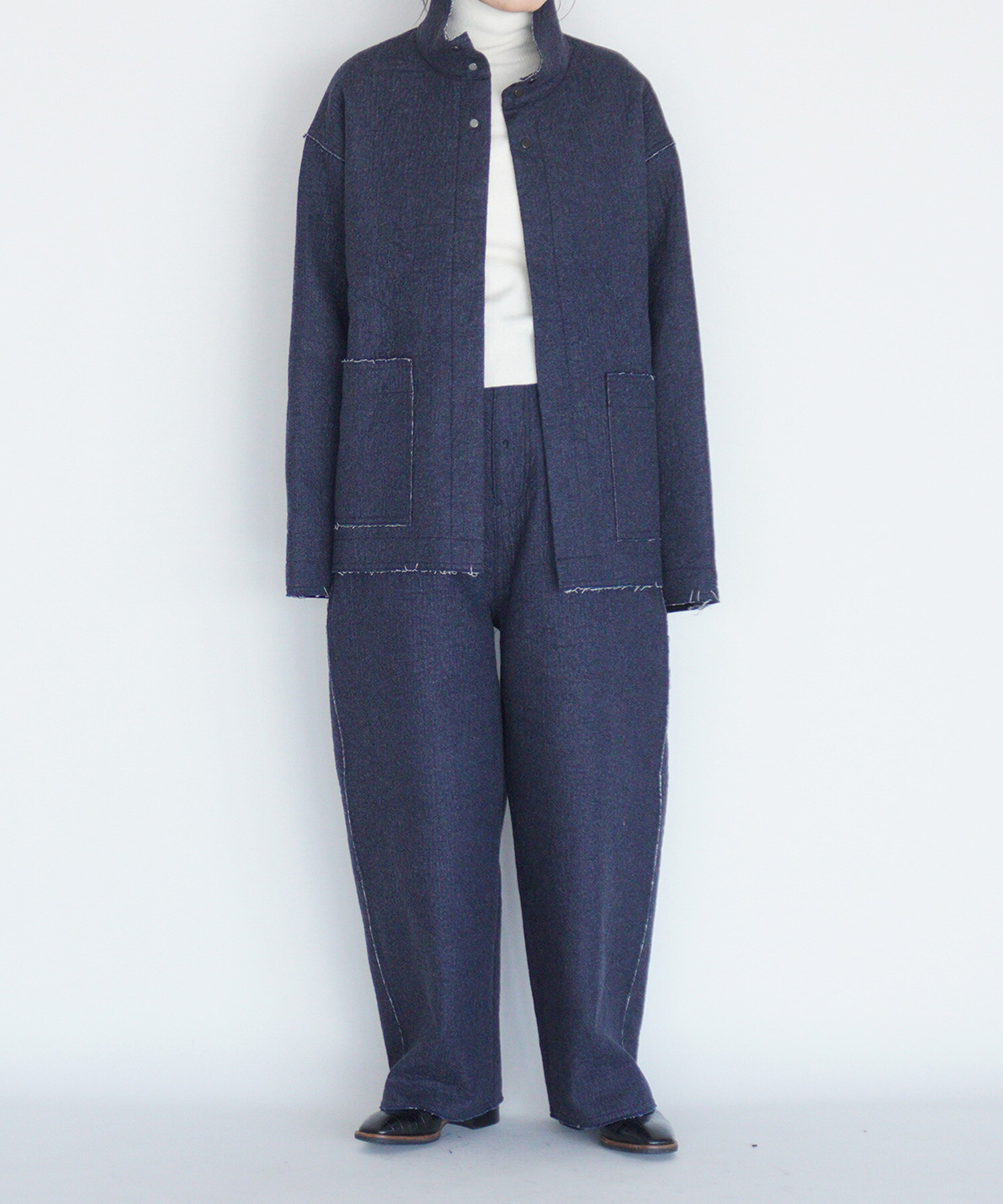 ジャケットはあえて高さのあるスタンドカラーを付けたデザイン。