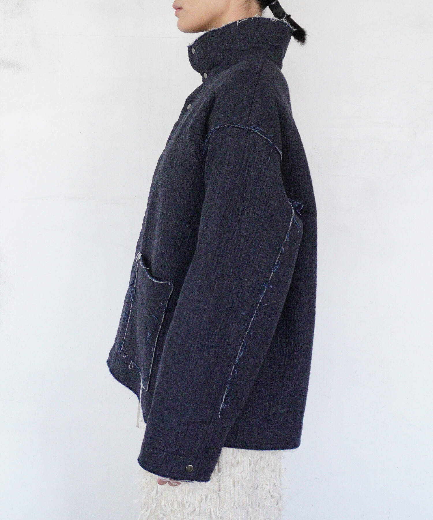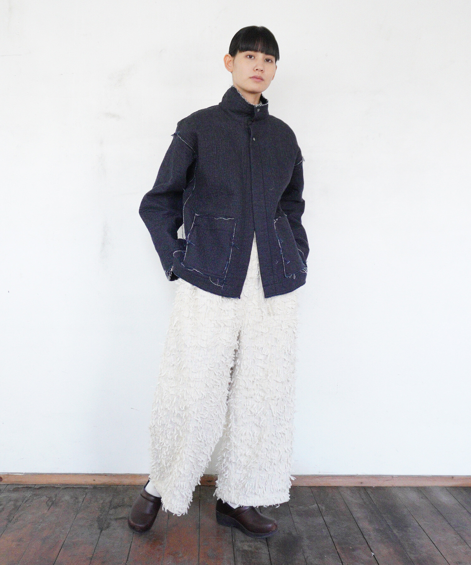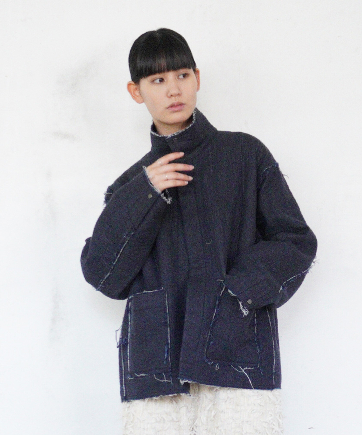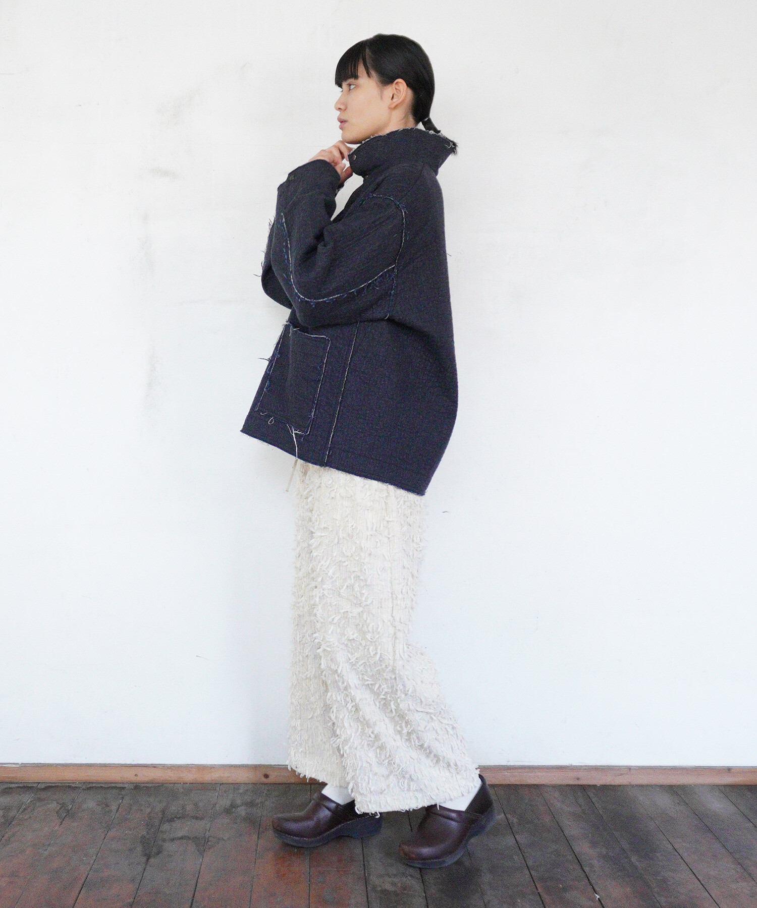 ジャケットはあえて高さのあるスタンドカラーを付けたデザイン。