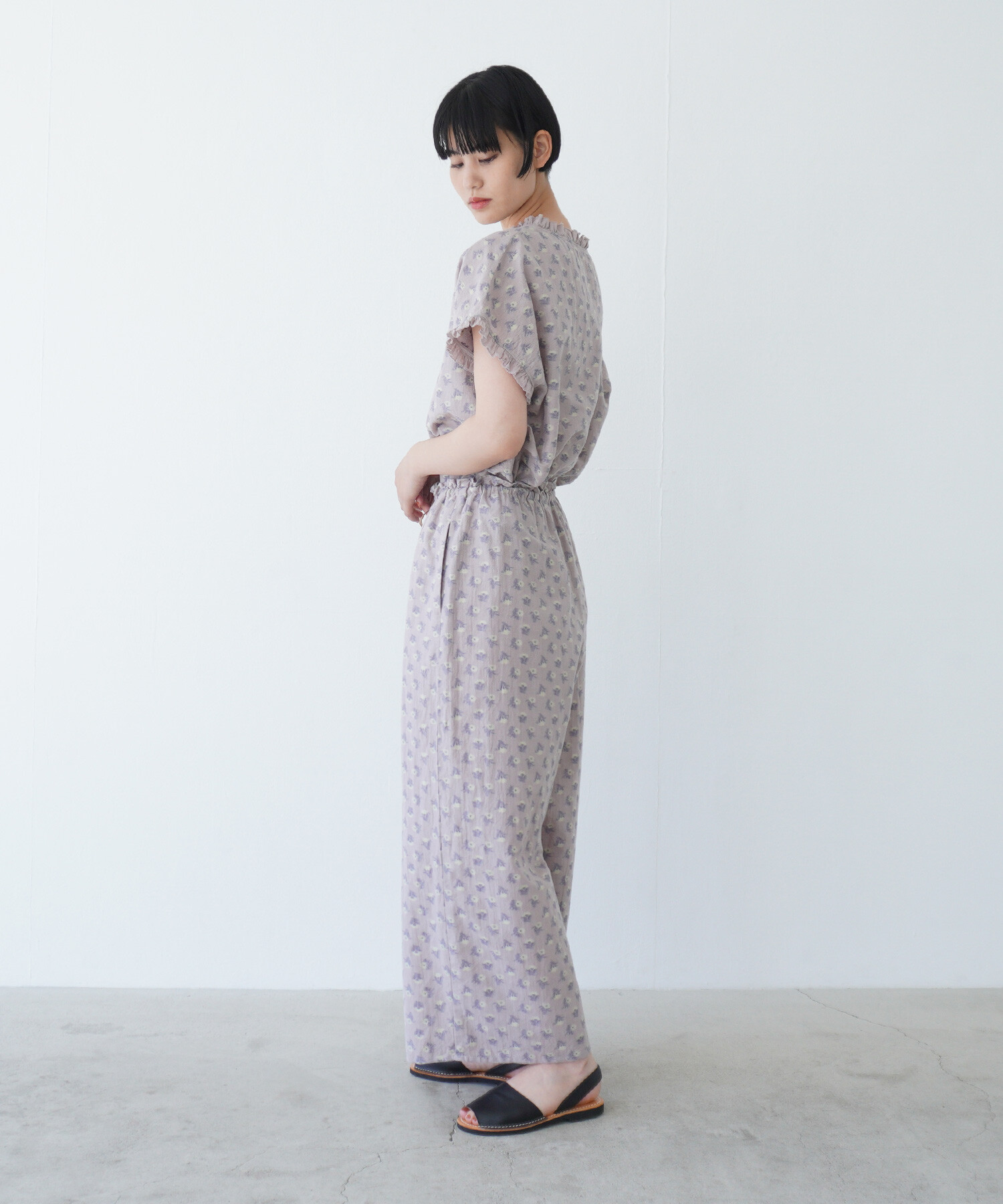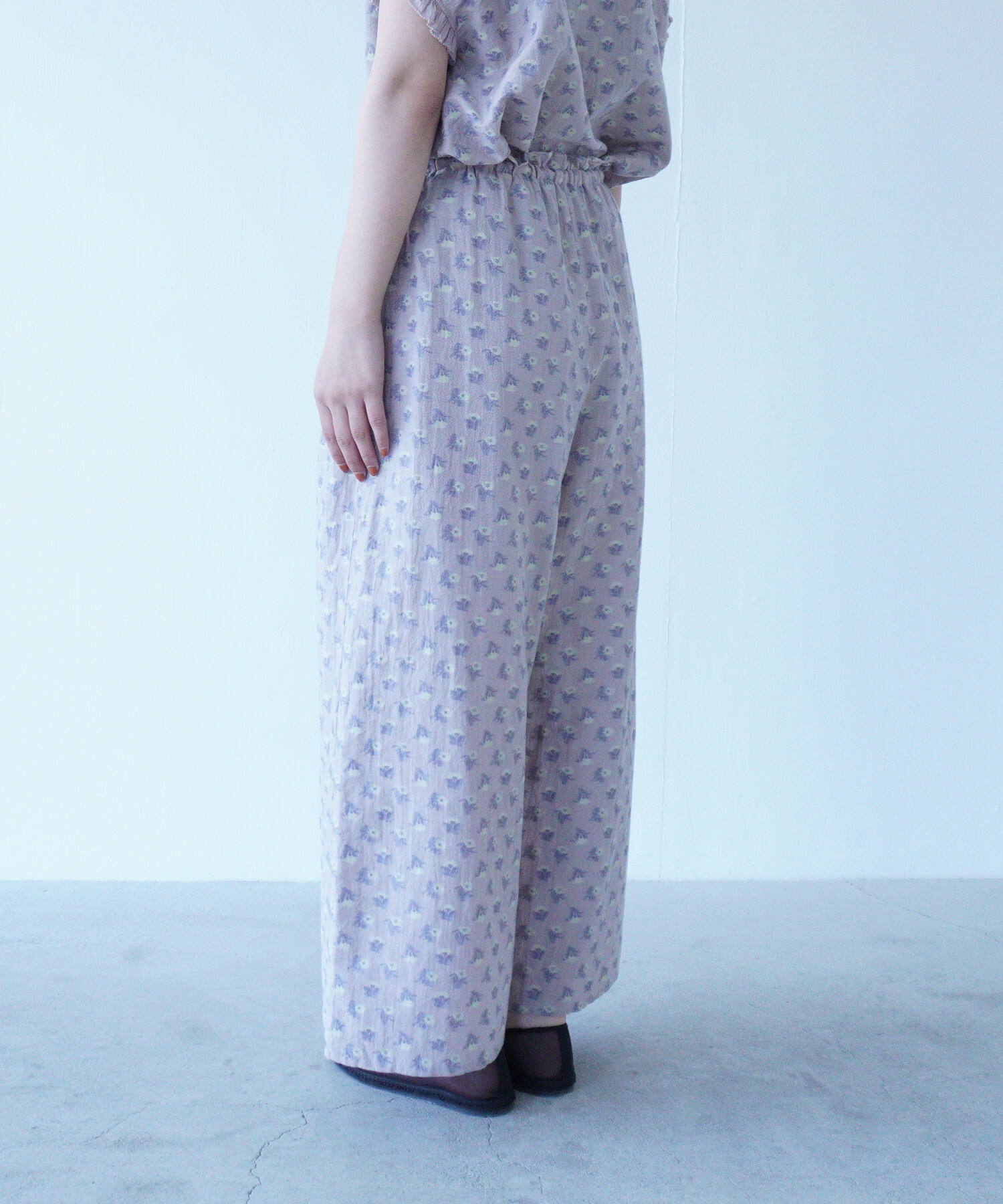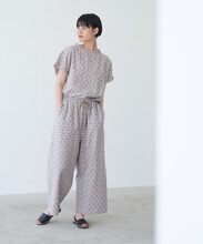 パンツはウエストゴムギャザーのワイドパンツ。