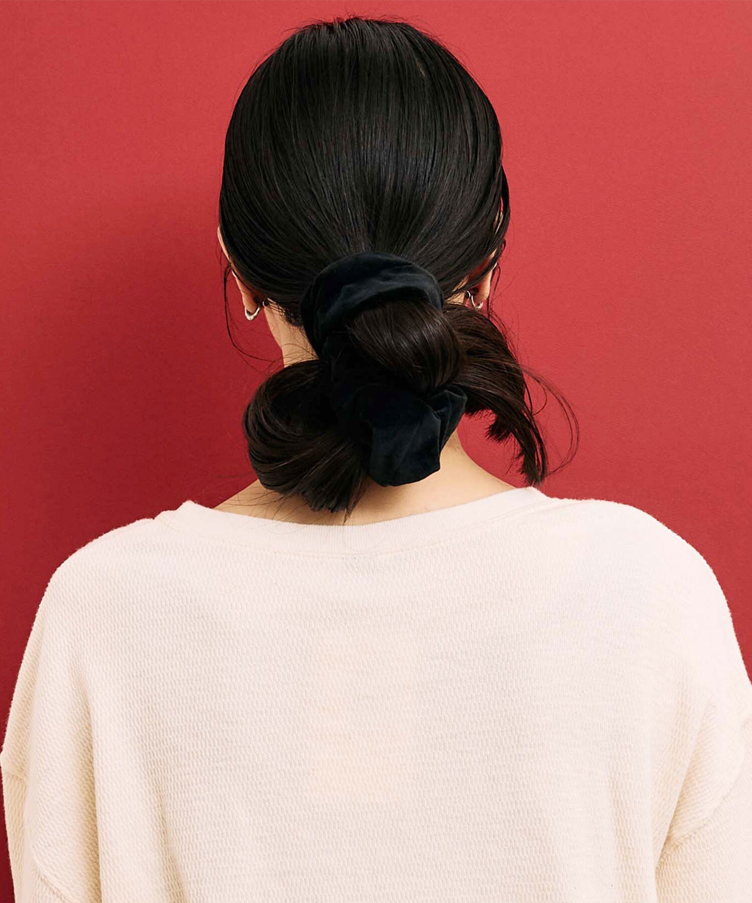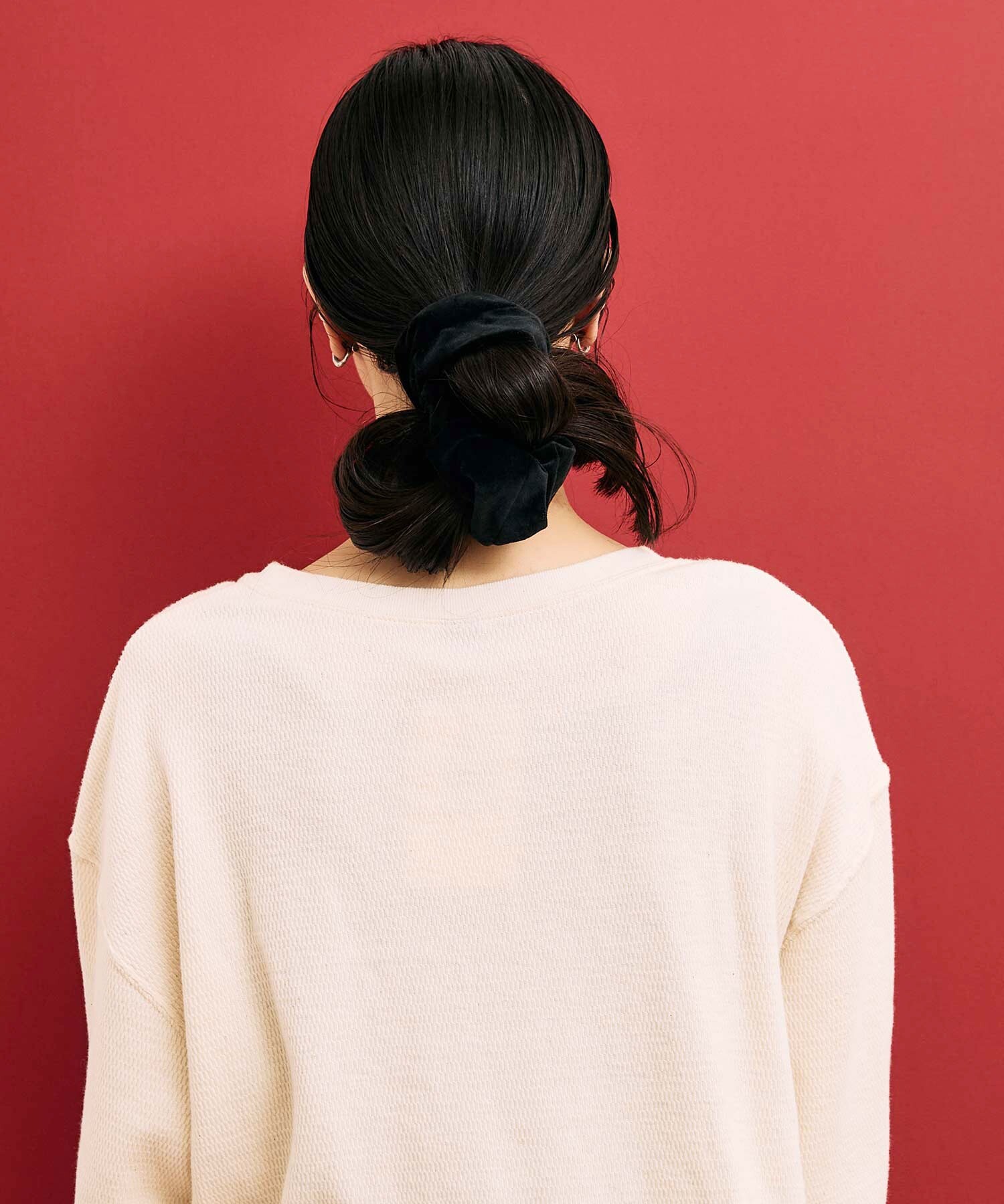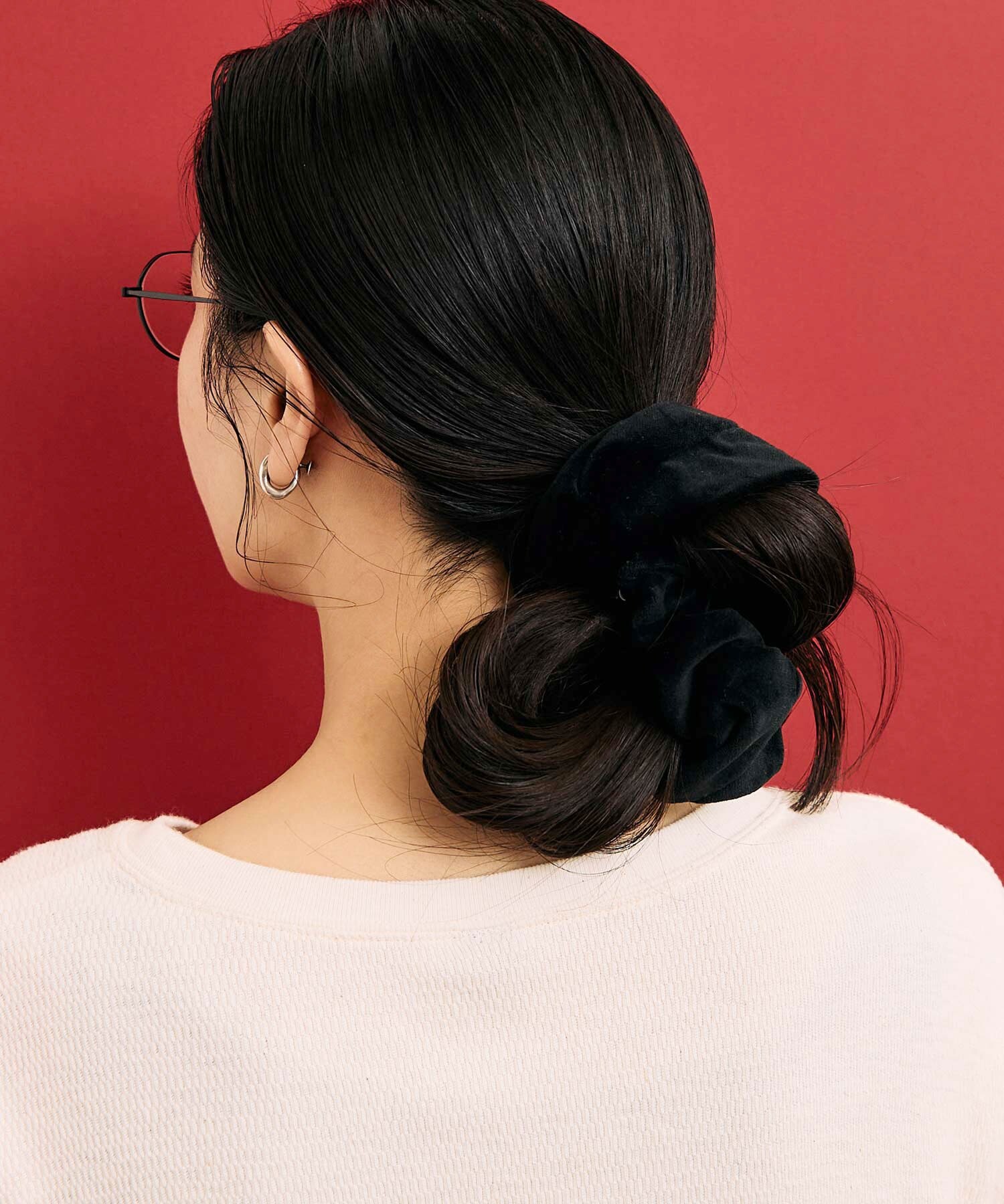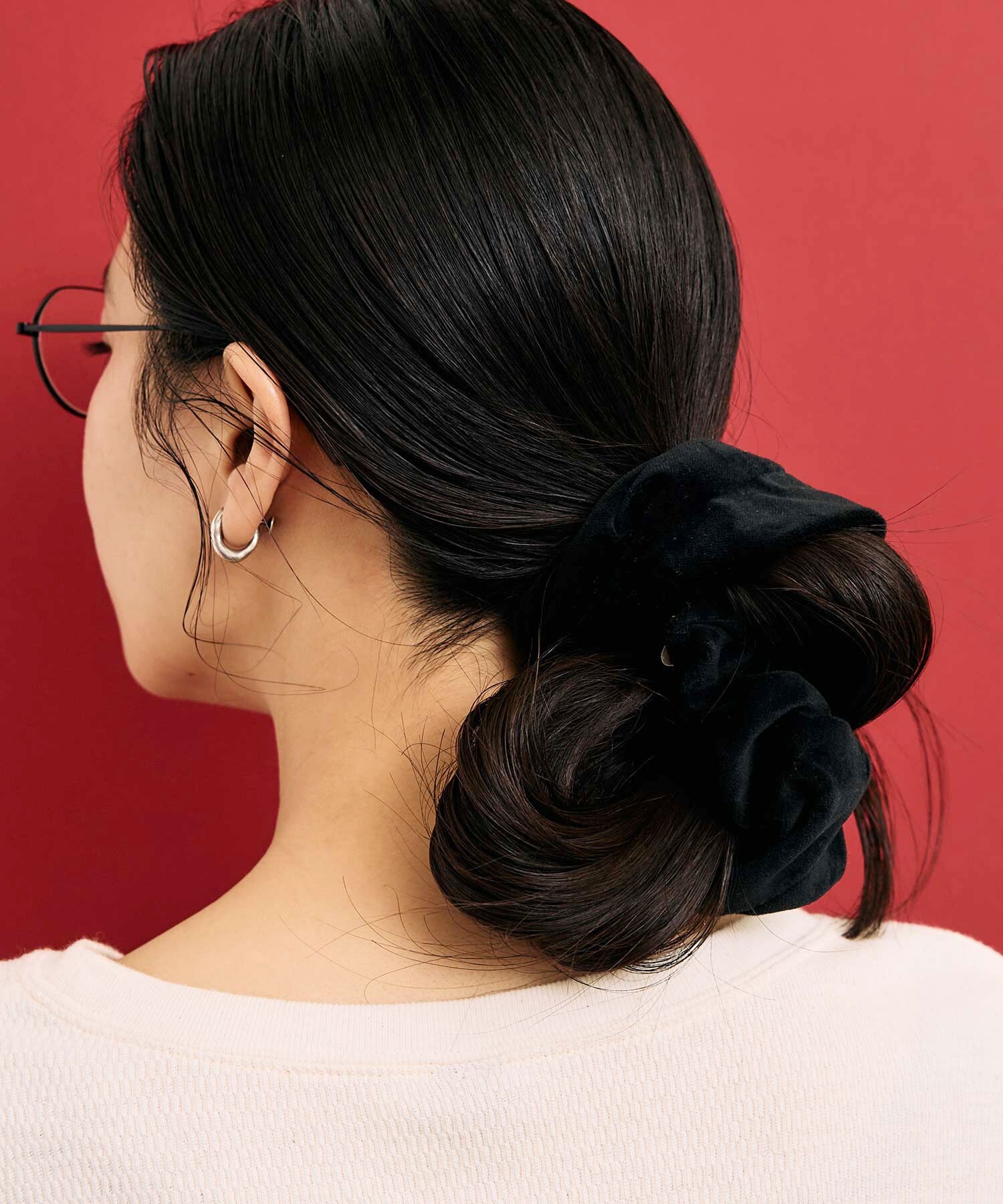 シンプルな着こなしのポイントになる個性的なシュシュたち。