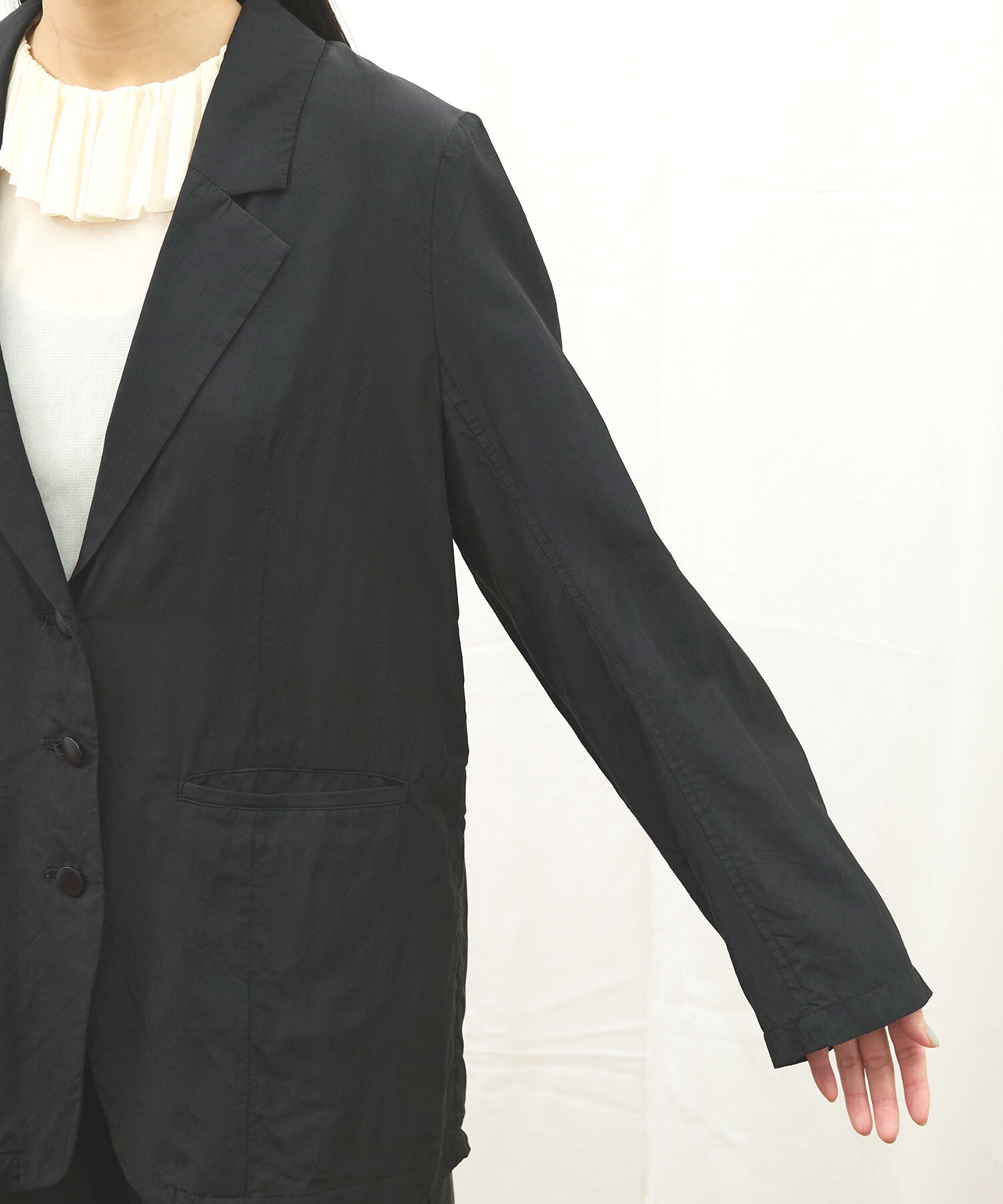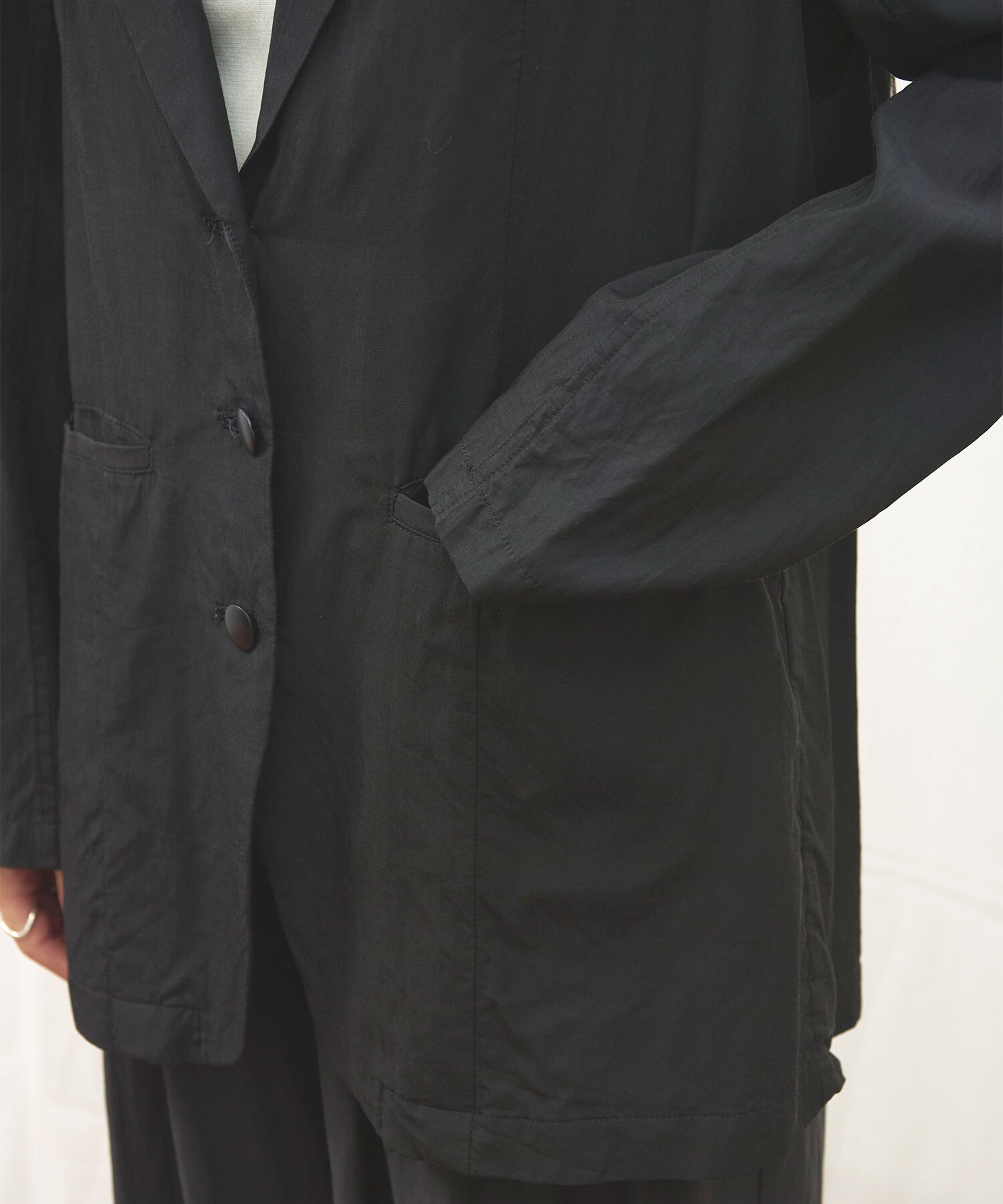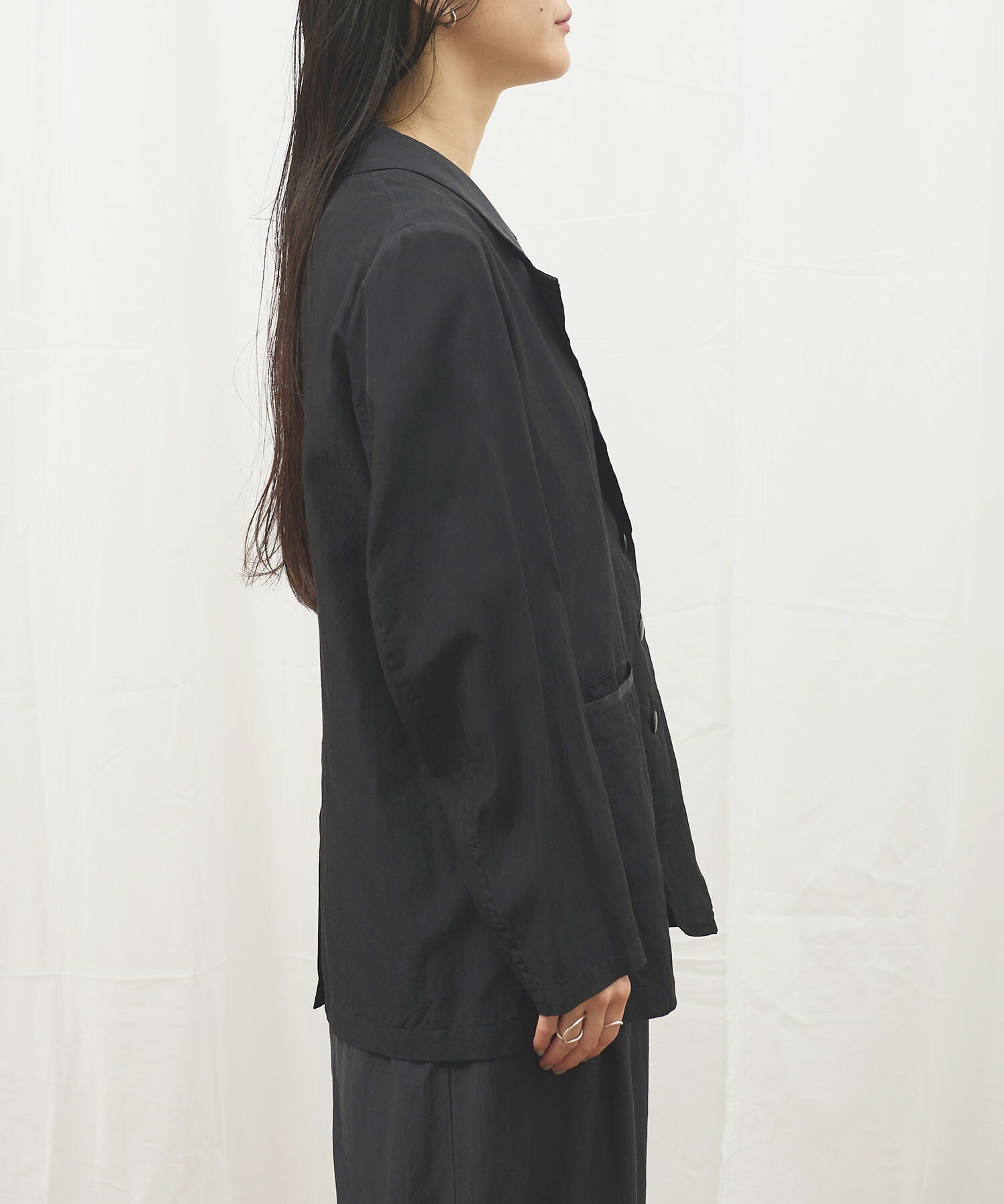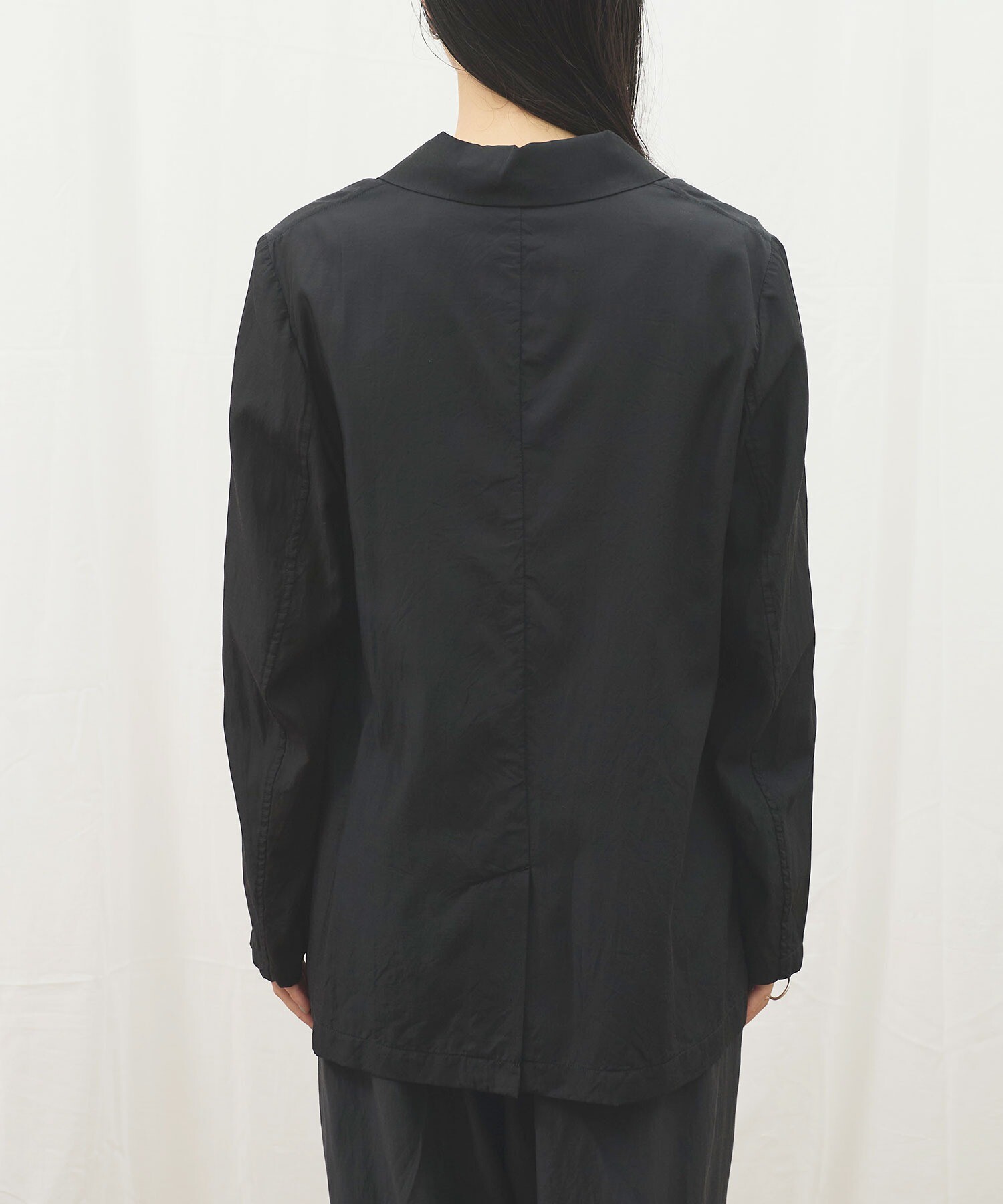 きりりとした雰囲気ではあるものの、肌触りがさらりとしていて軽く、まるでシャツのように日常で着たくなる1枚です。