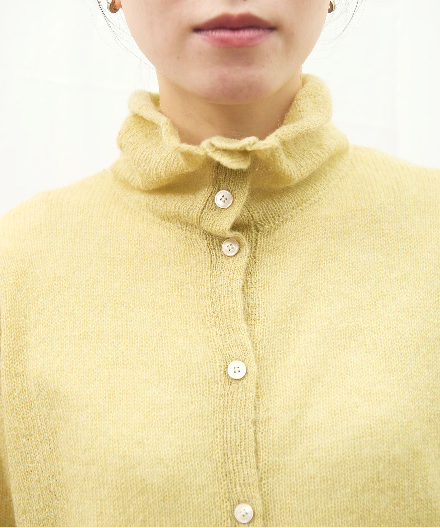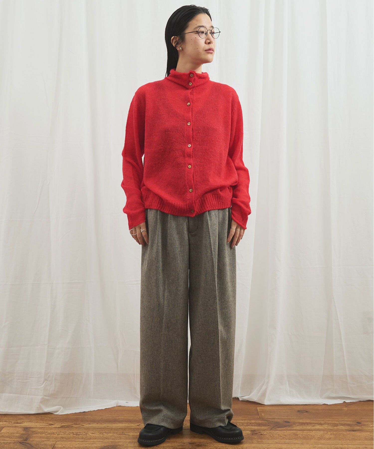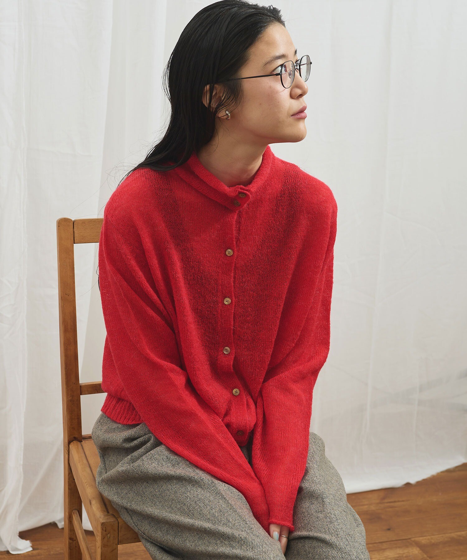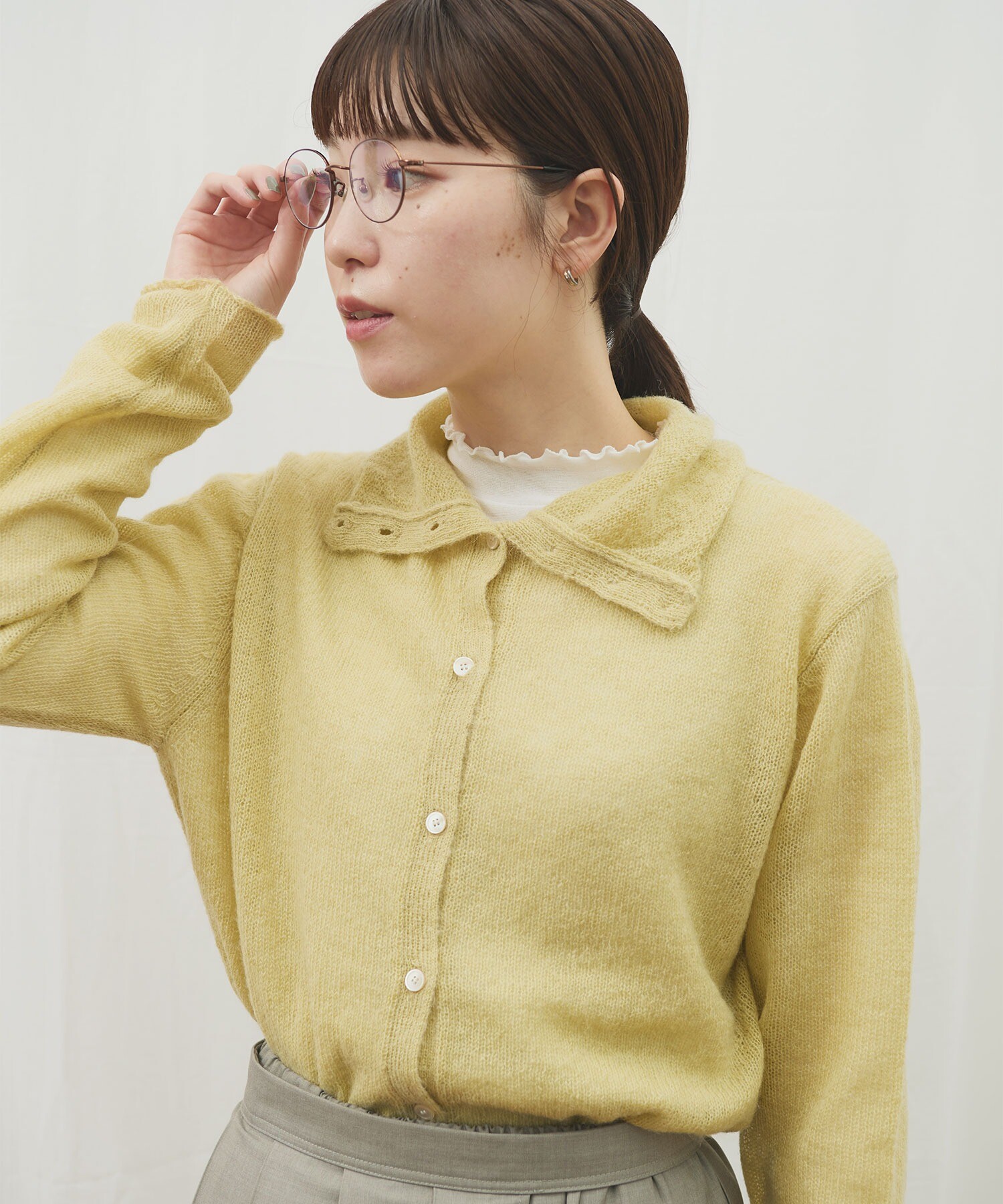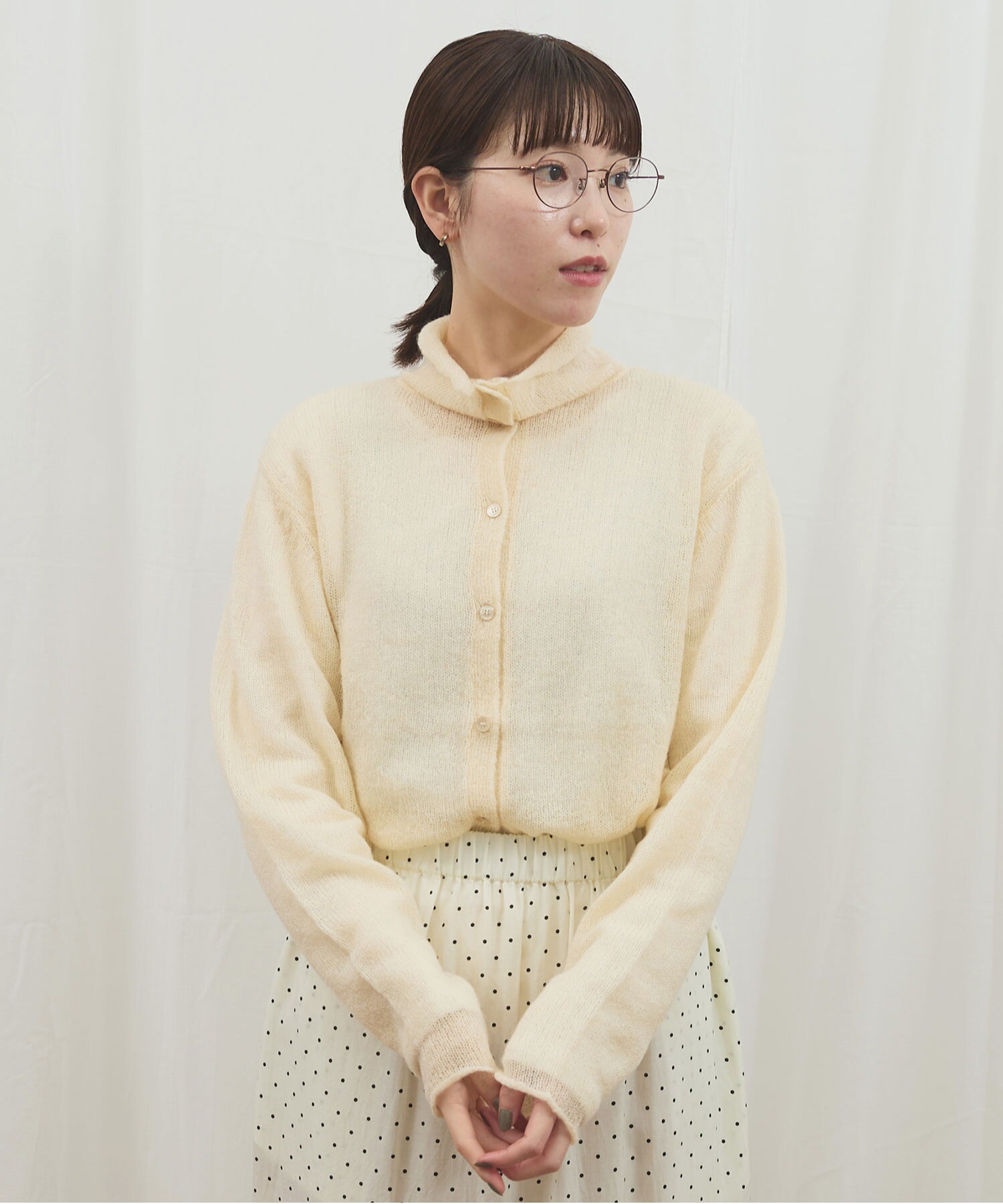 カーディガンはボタンの留め位置でさまざまな雰囲気で着ていただけます。