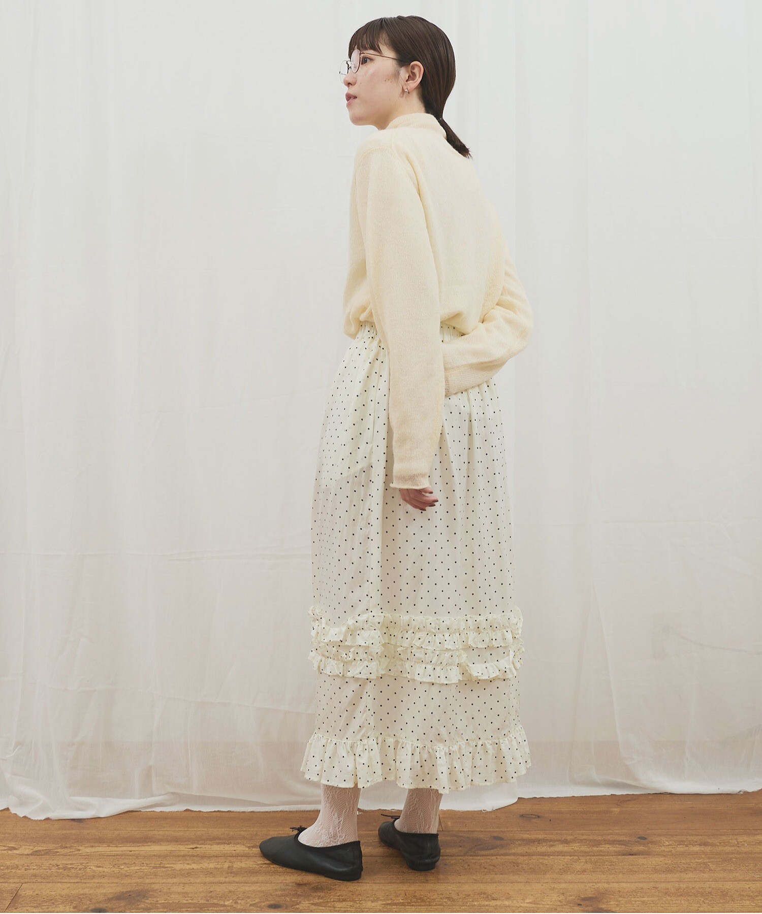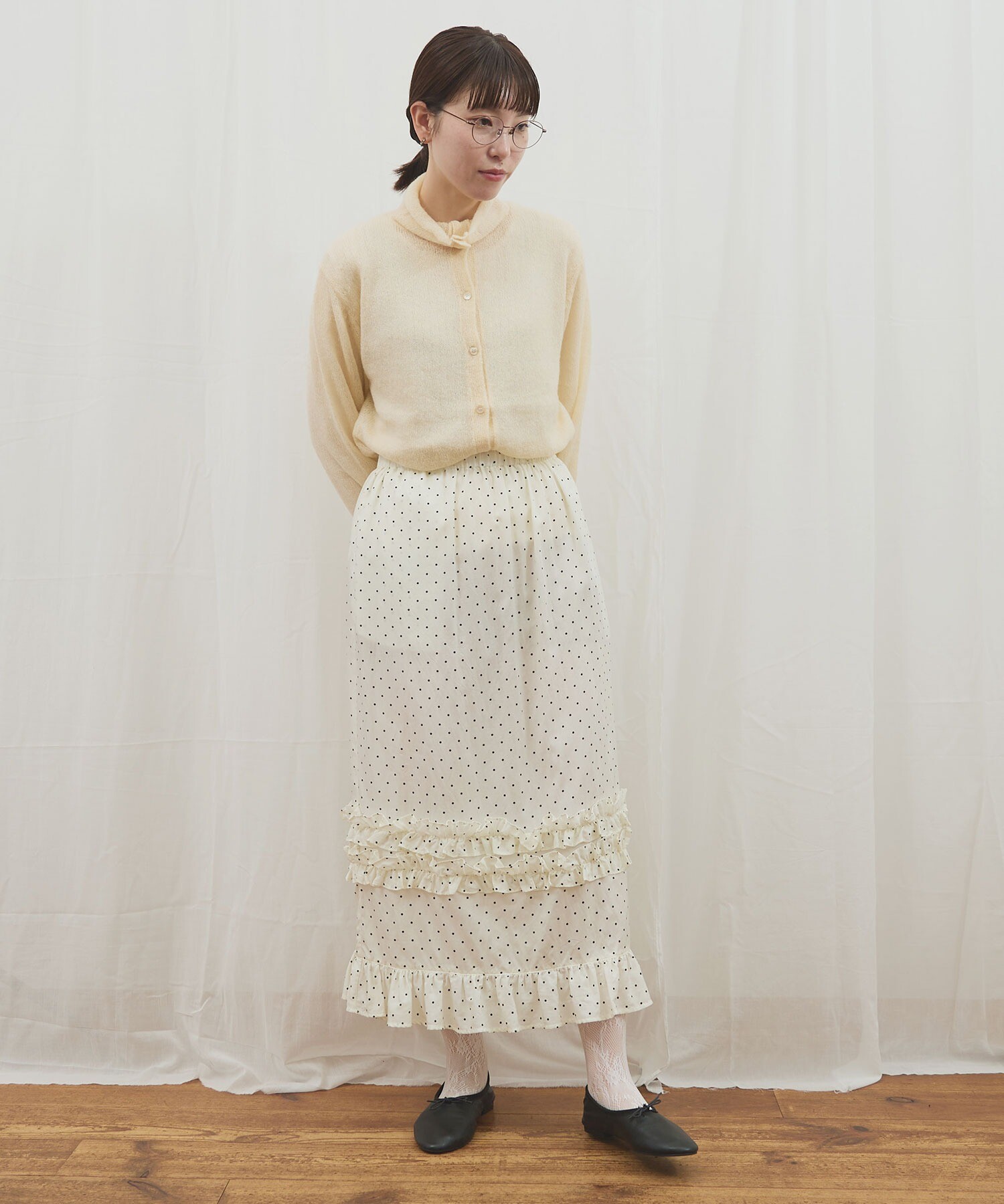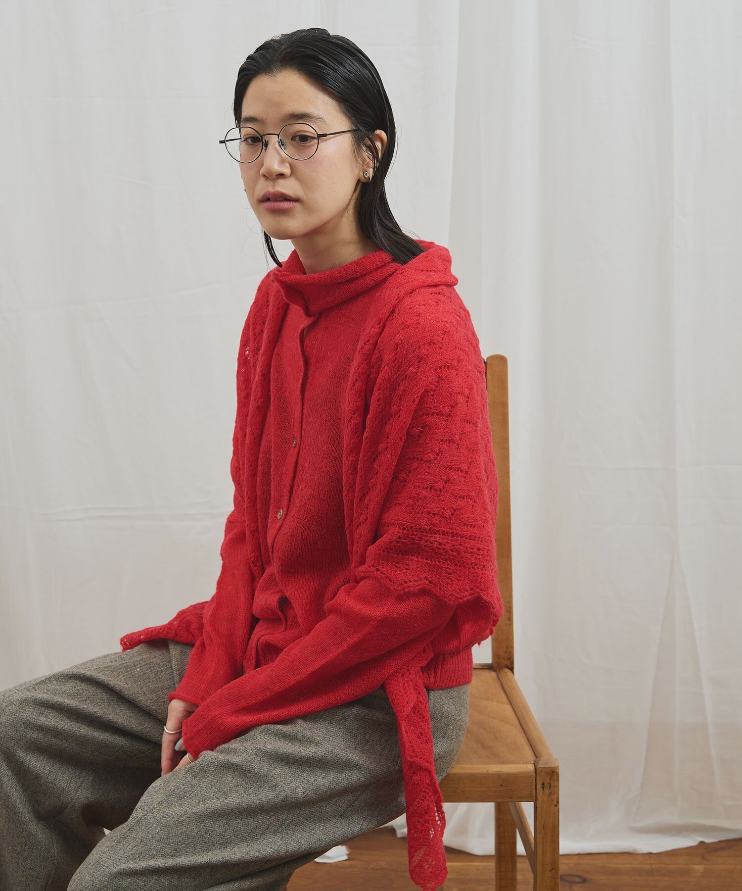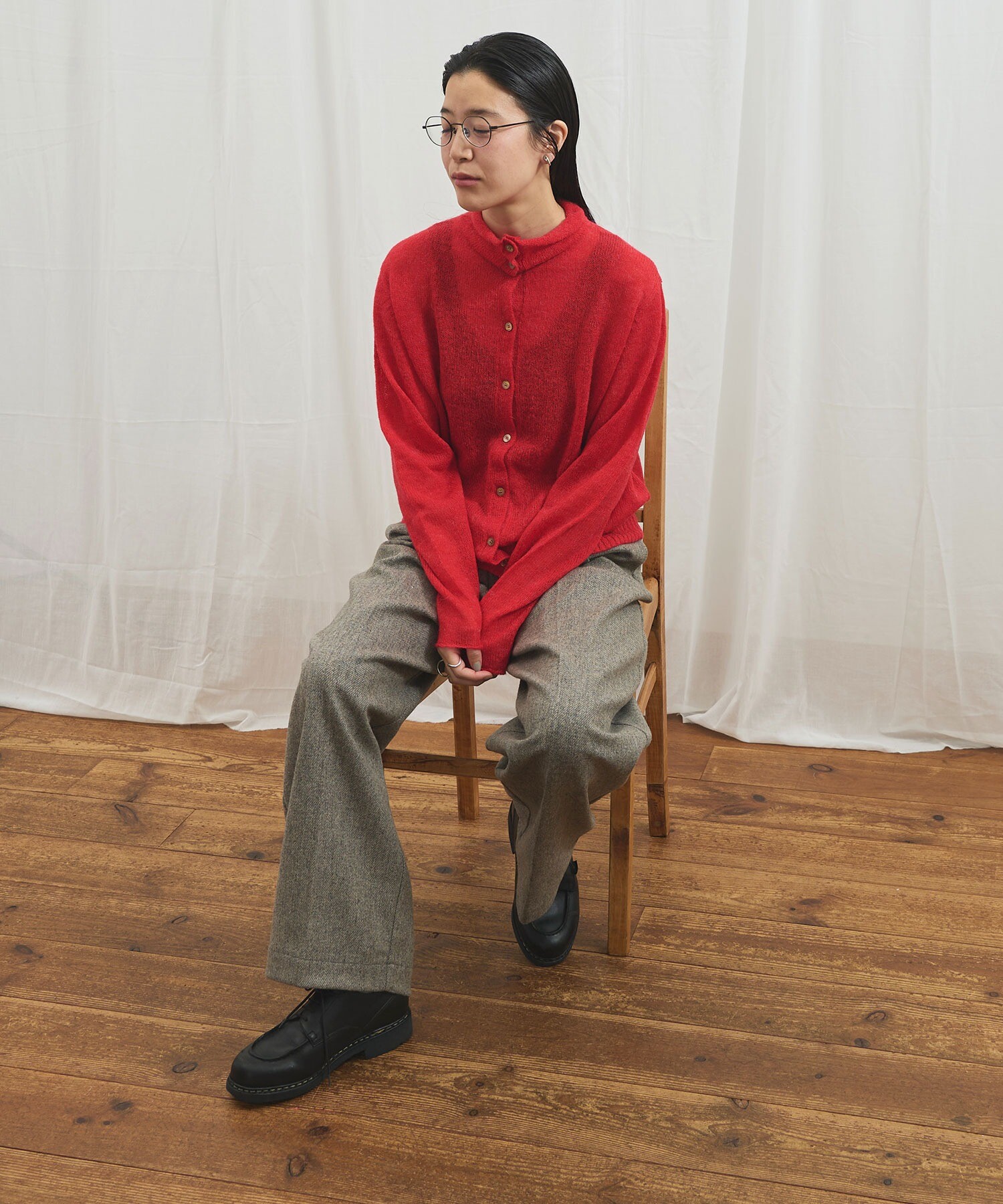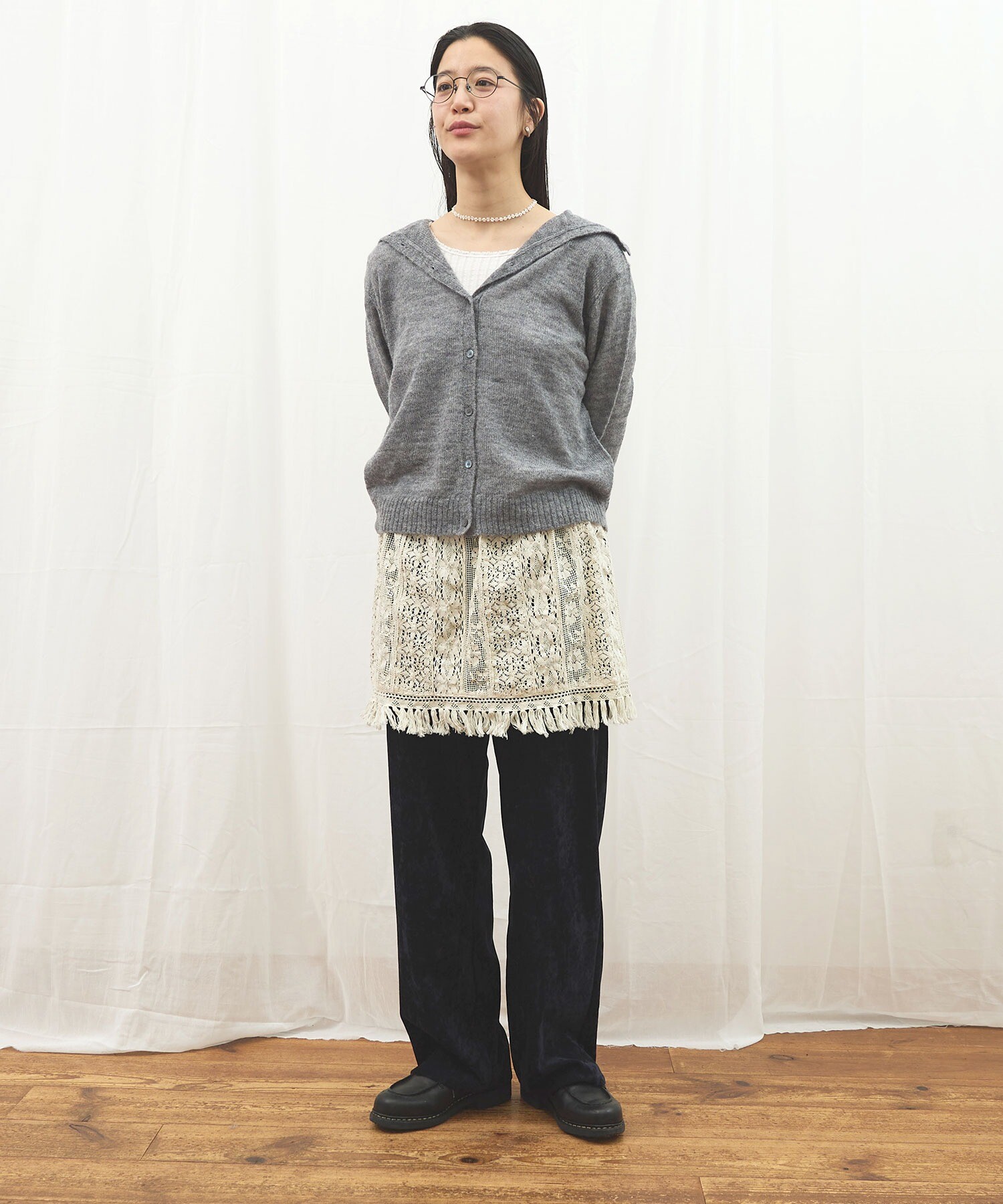 カーディガンはボタンの留め位置でさまざまな雰囲気で着ていただけます。