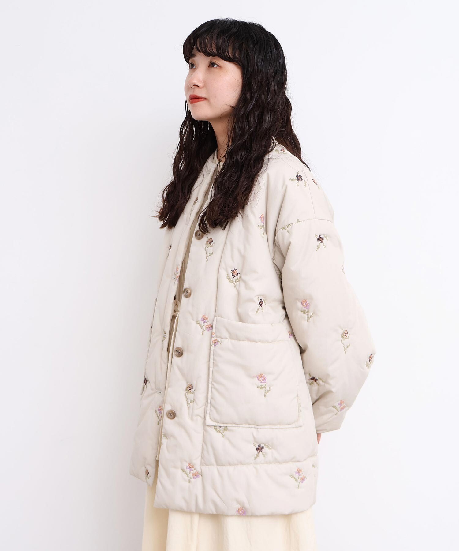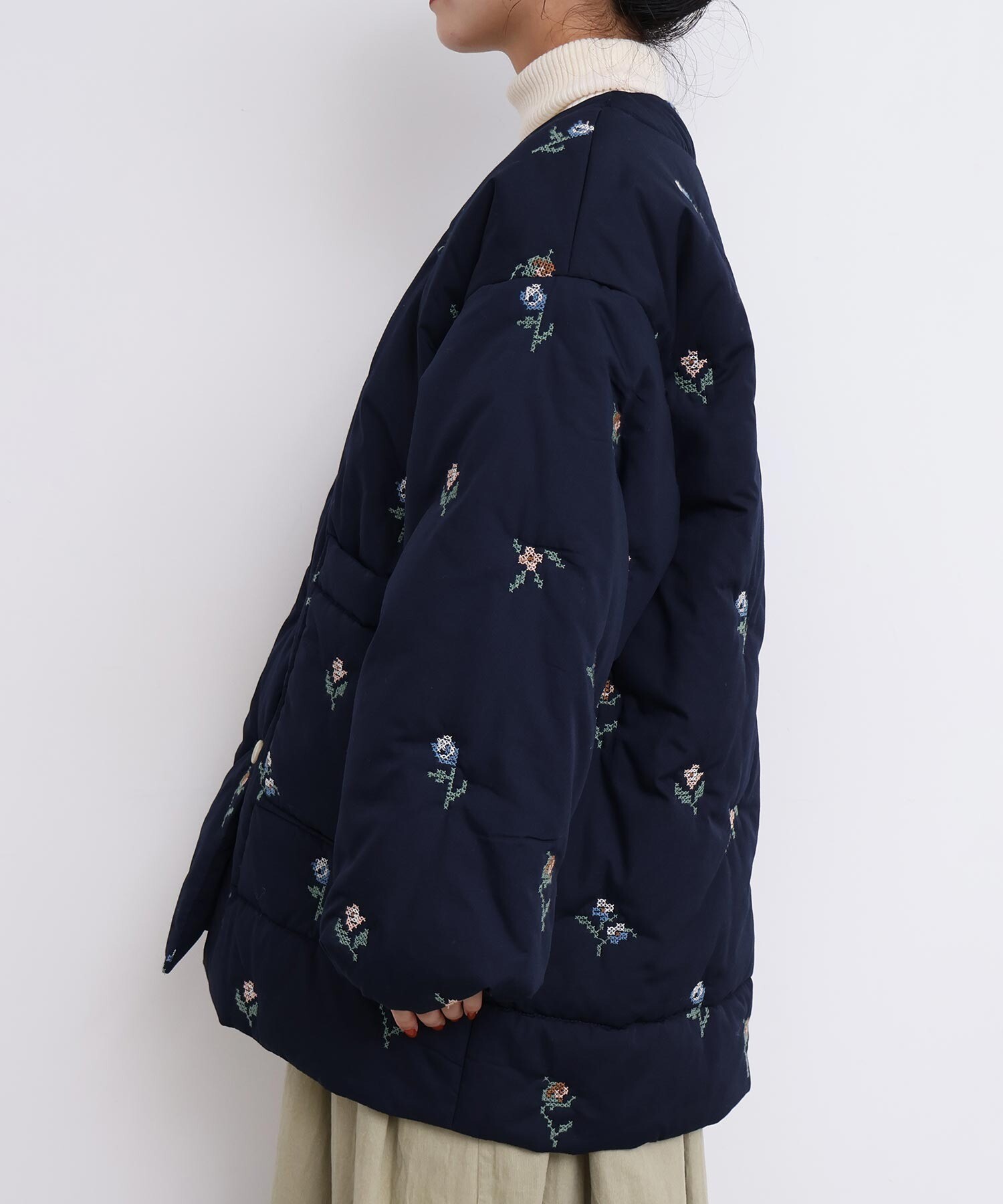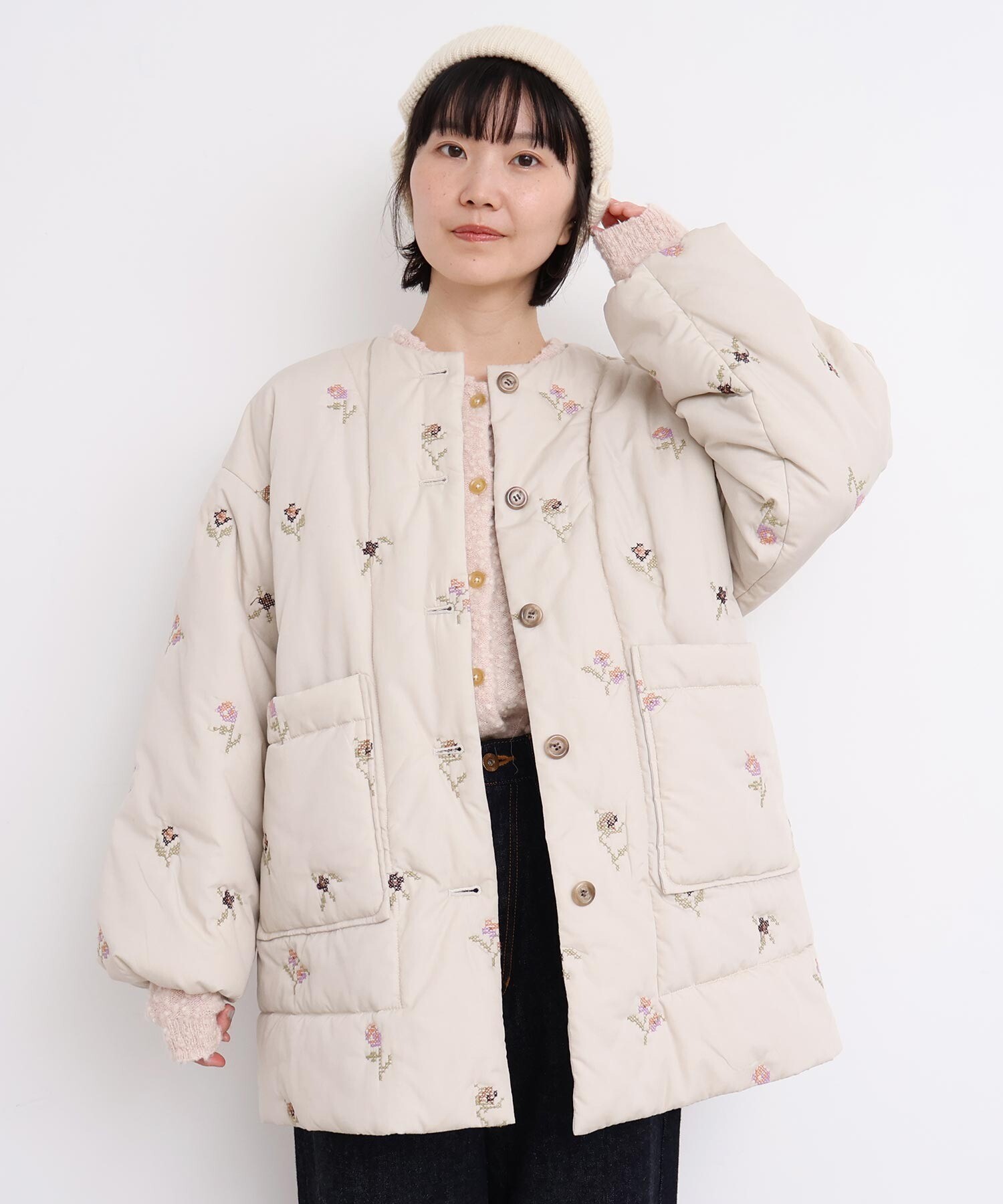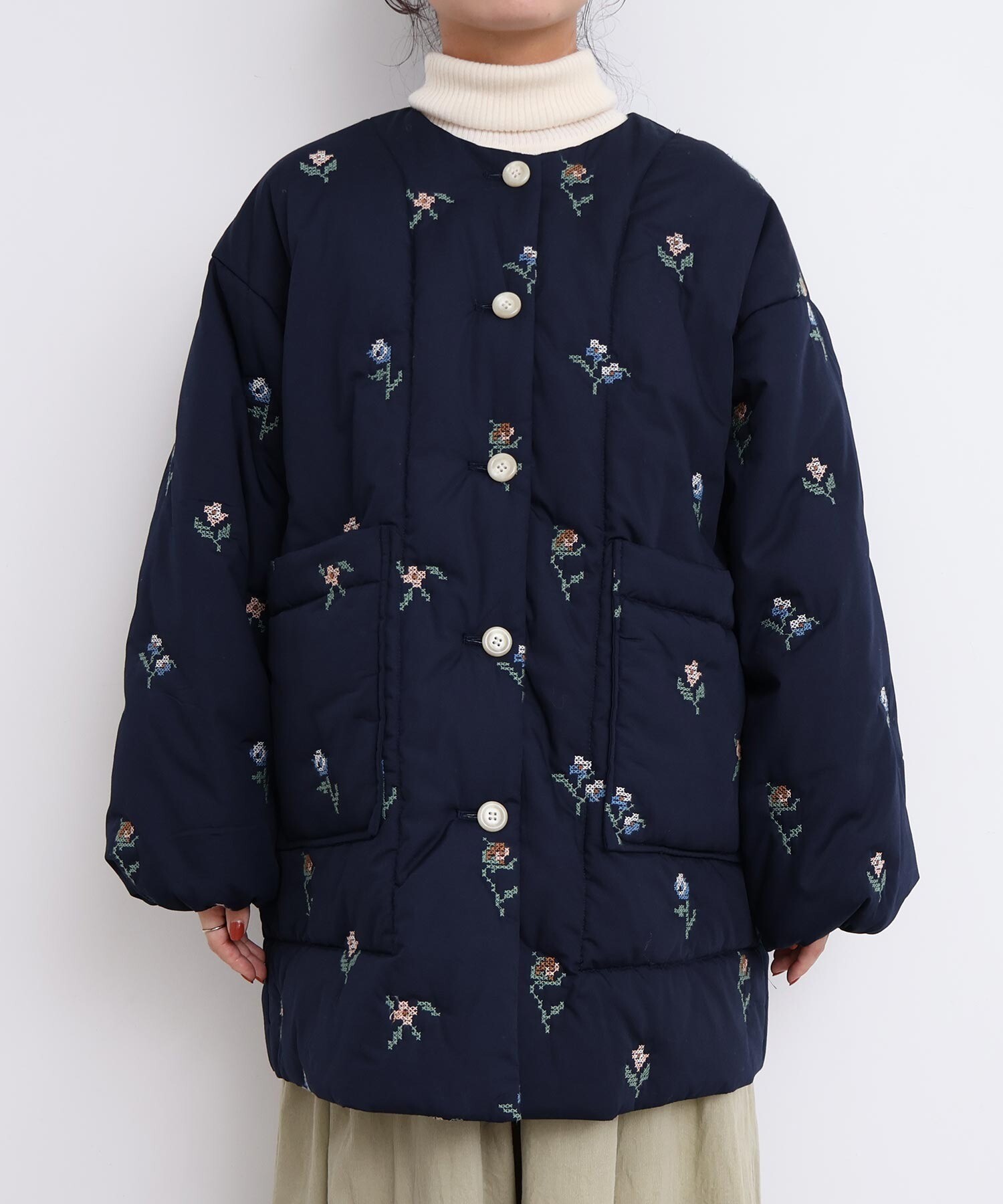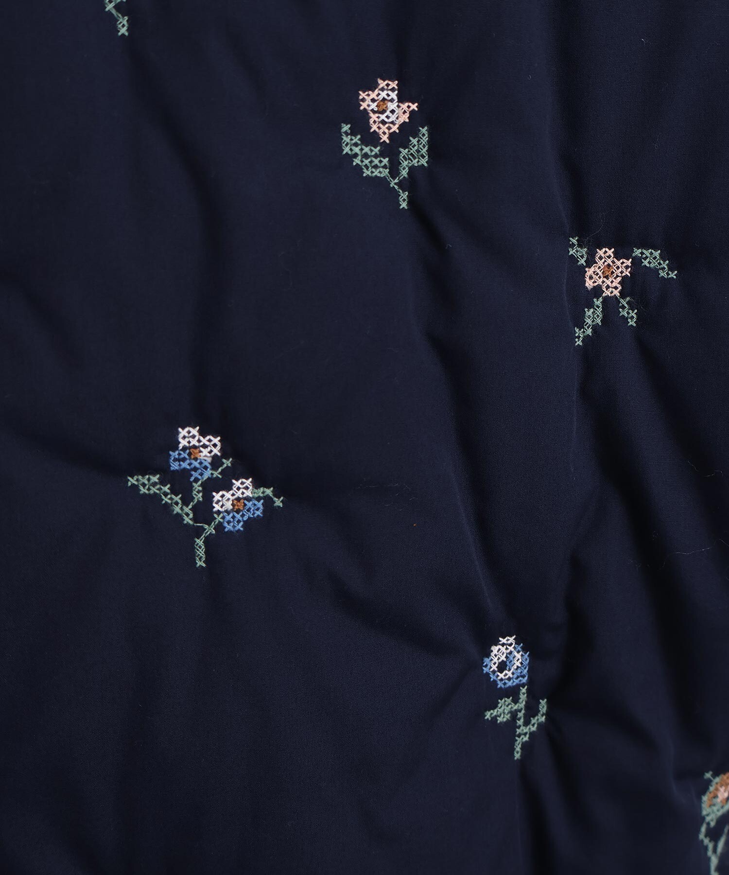 ちょこんと咲いたお花の刺繍は中綿を押さえる役割も果たしています。