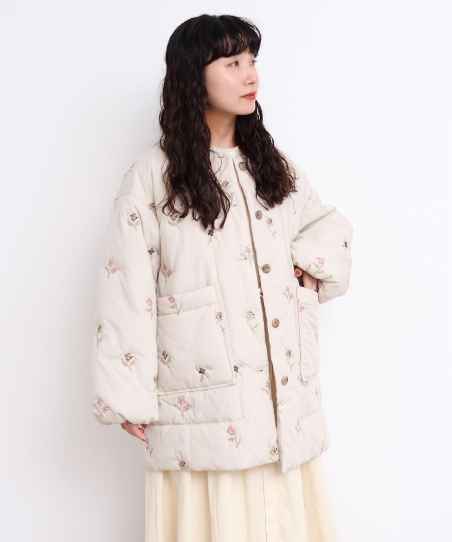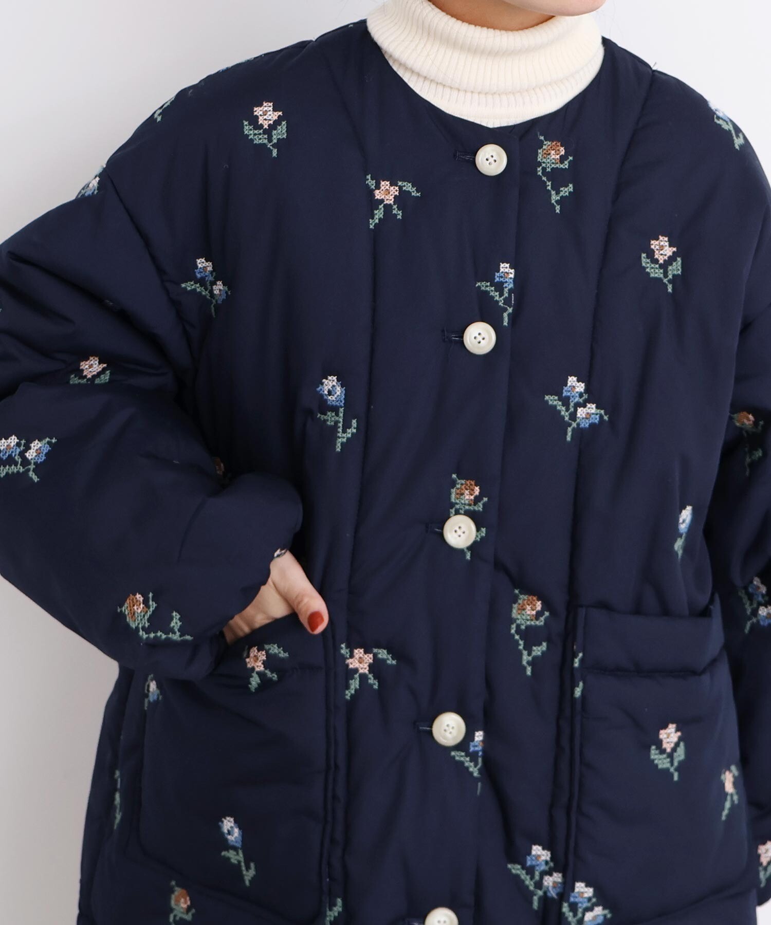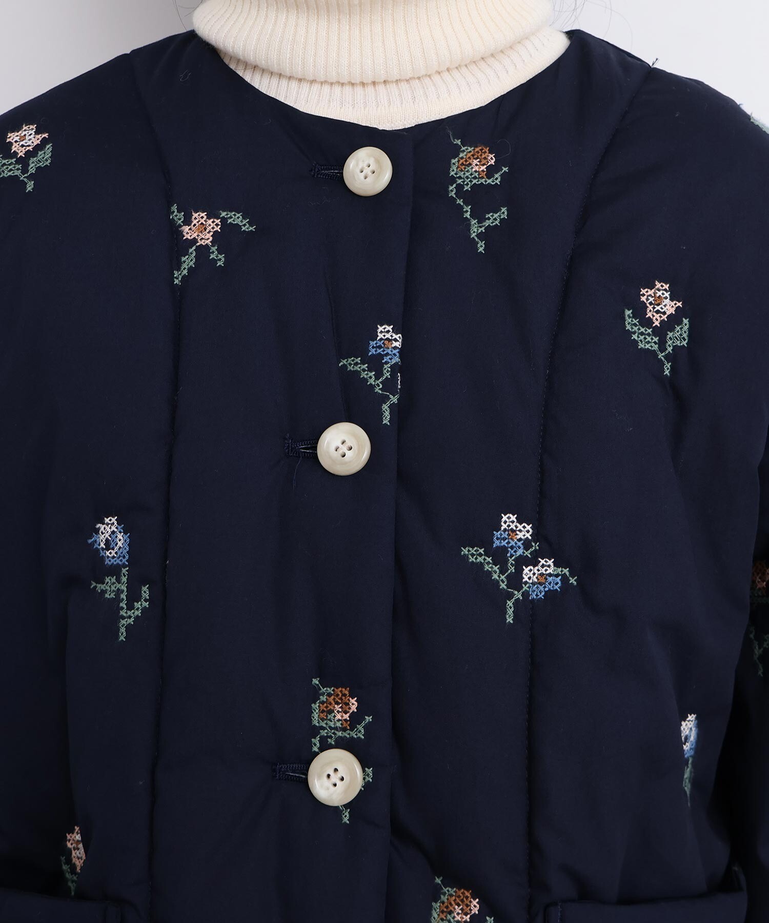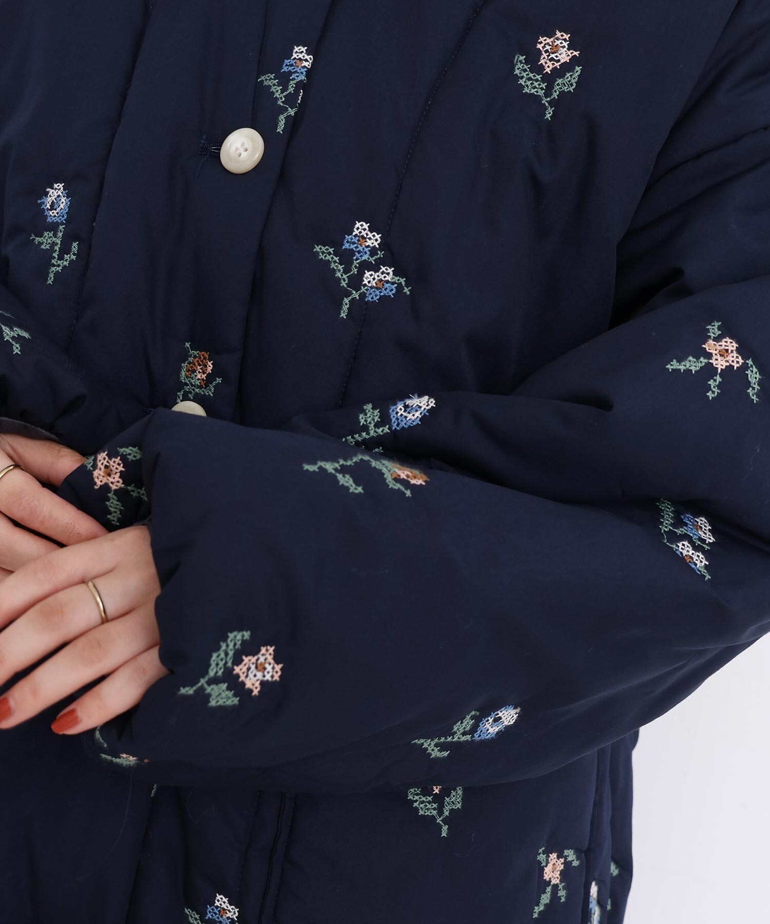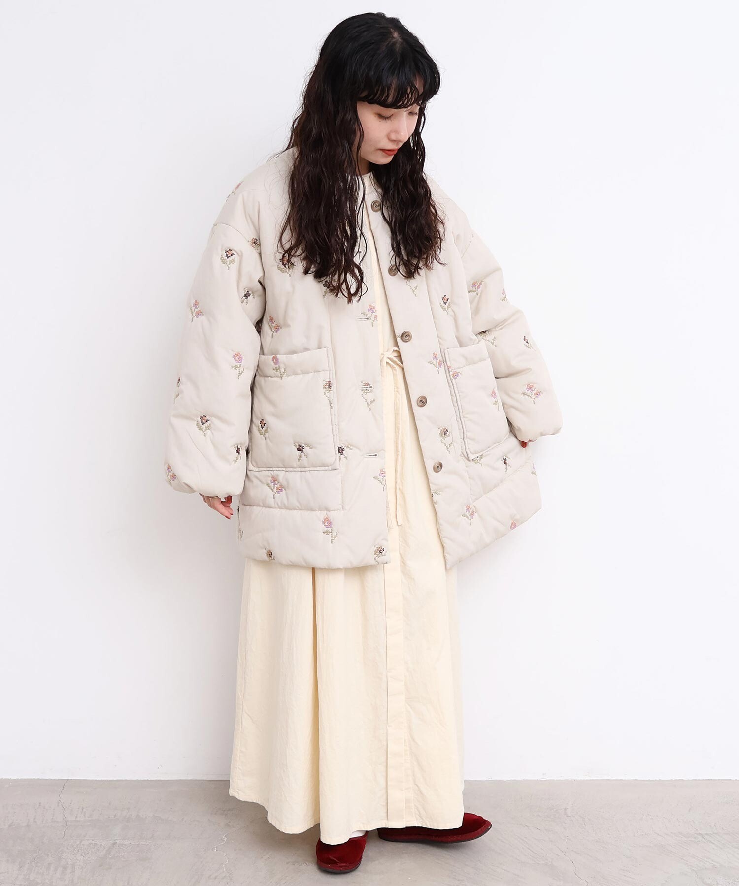 ちょこんと咲いたお花の刺繍は中綿を押さえる役割も果たしています。