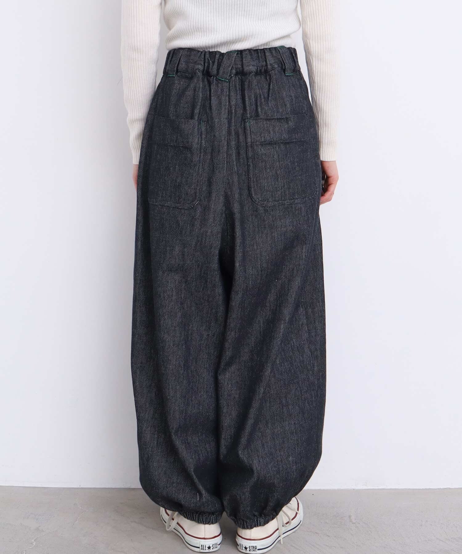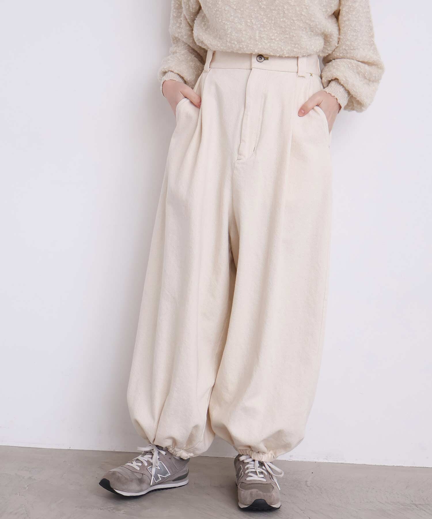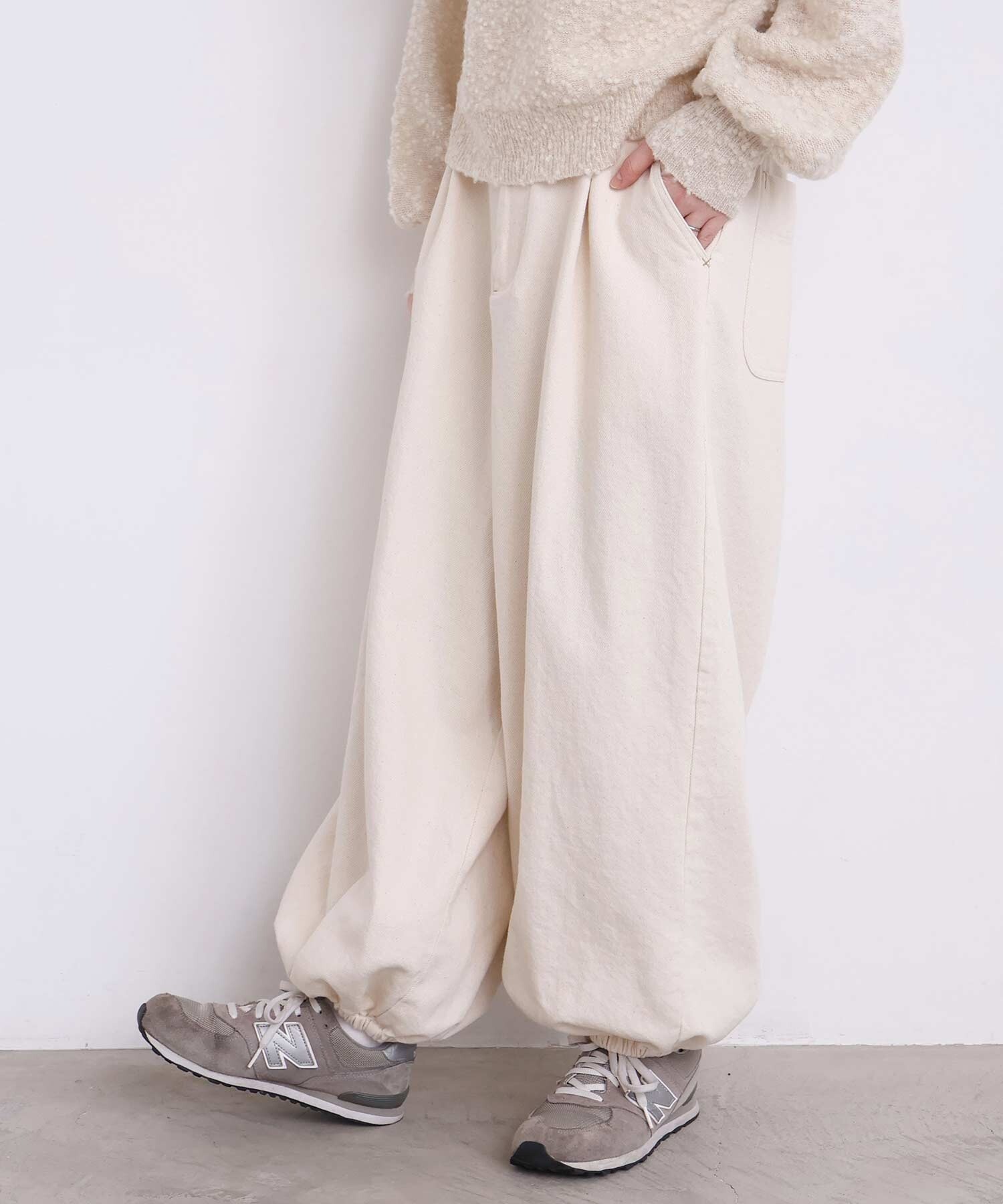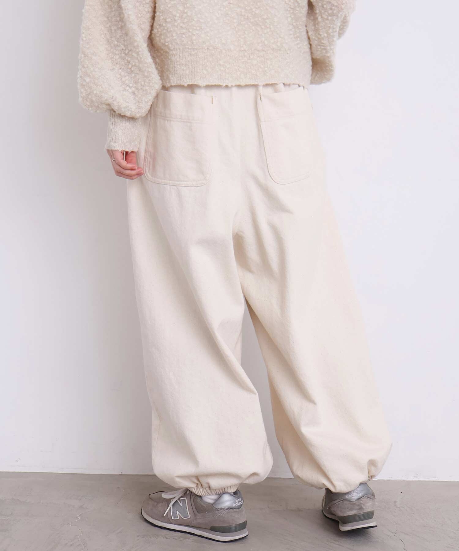丸みのある裾しぼりやウエストの後ろゴム仕様。