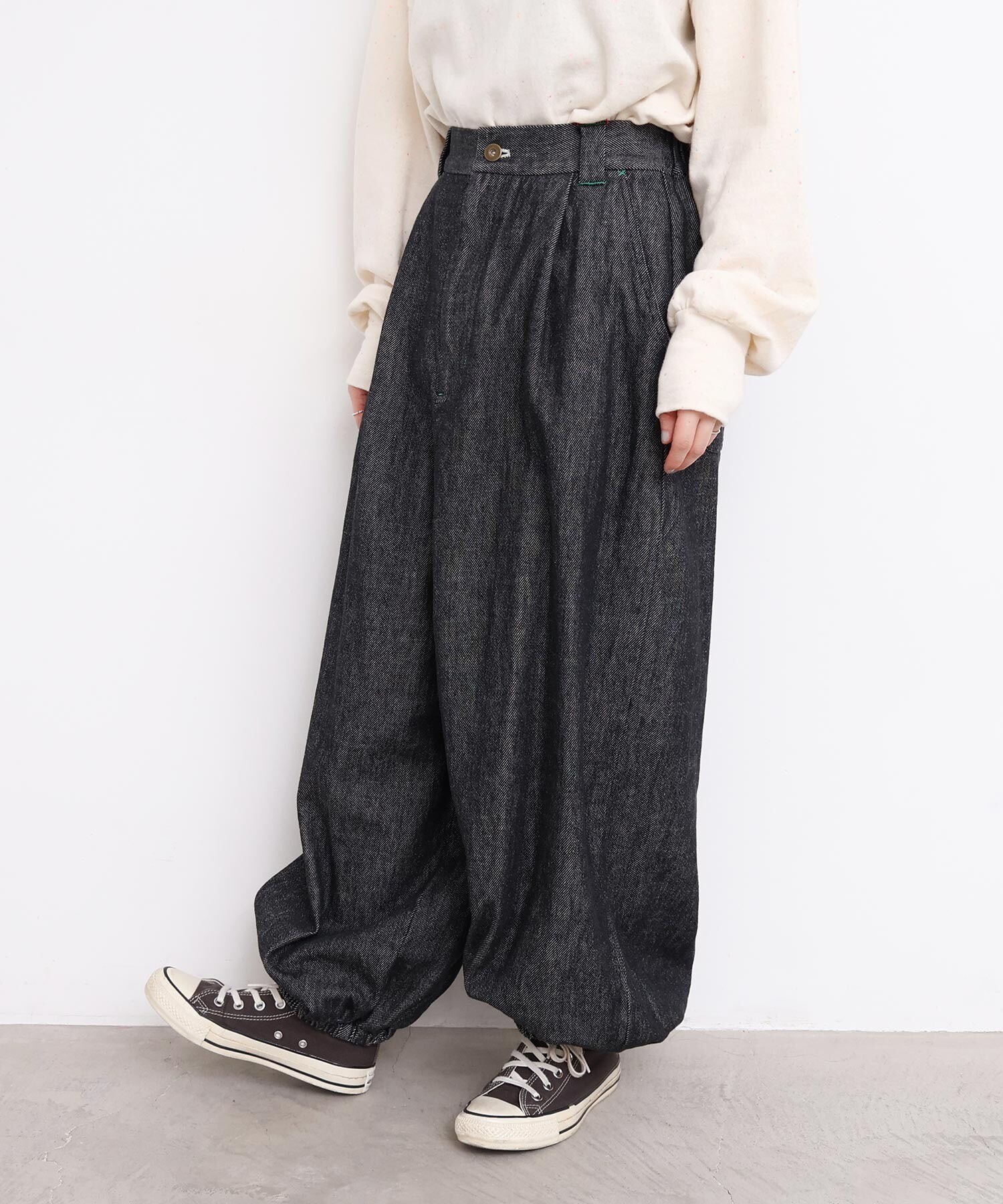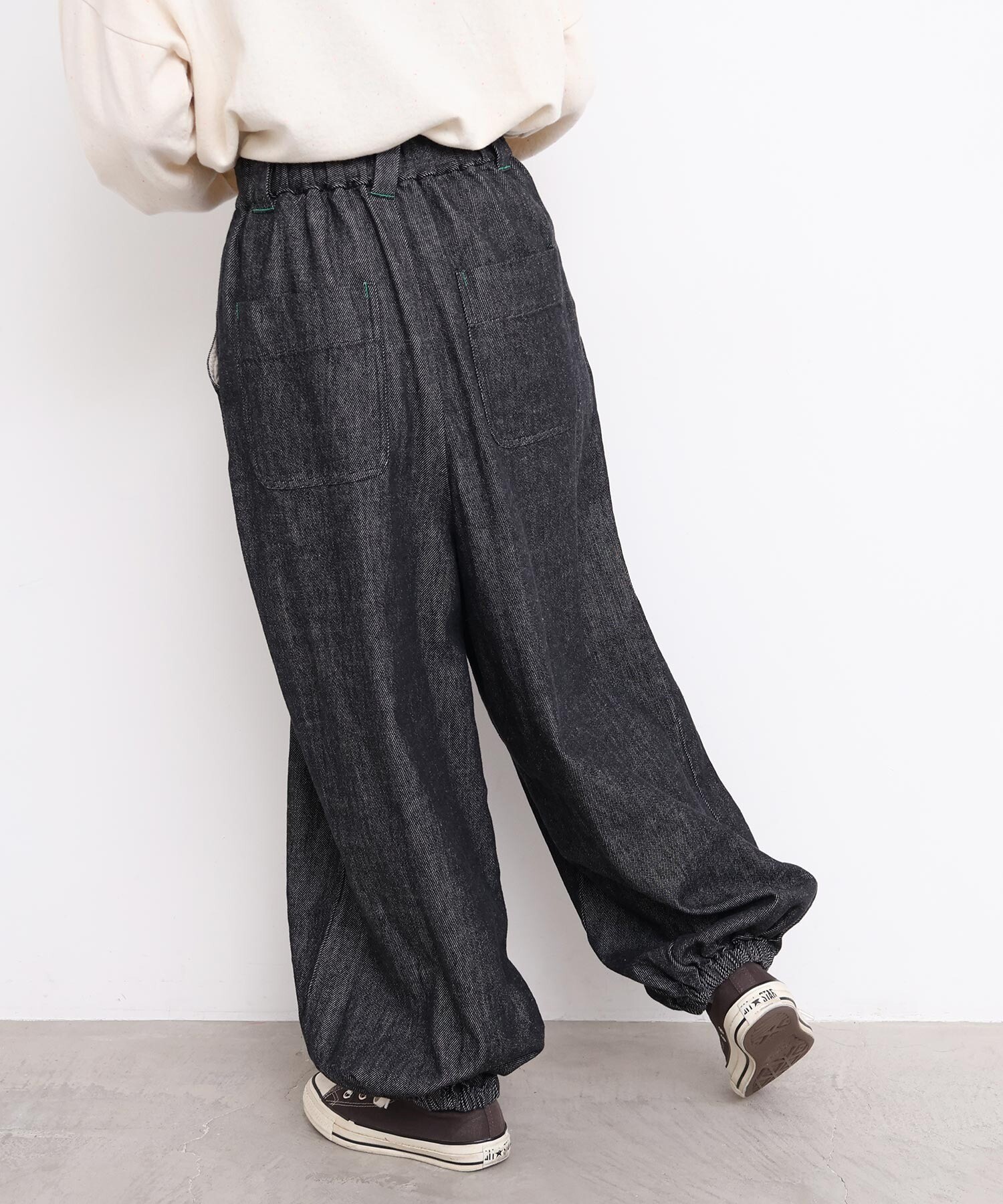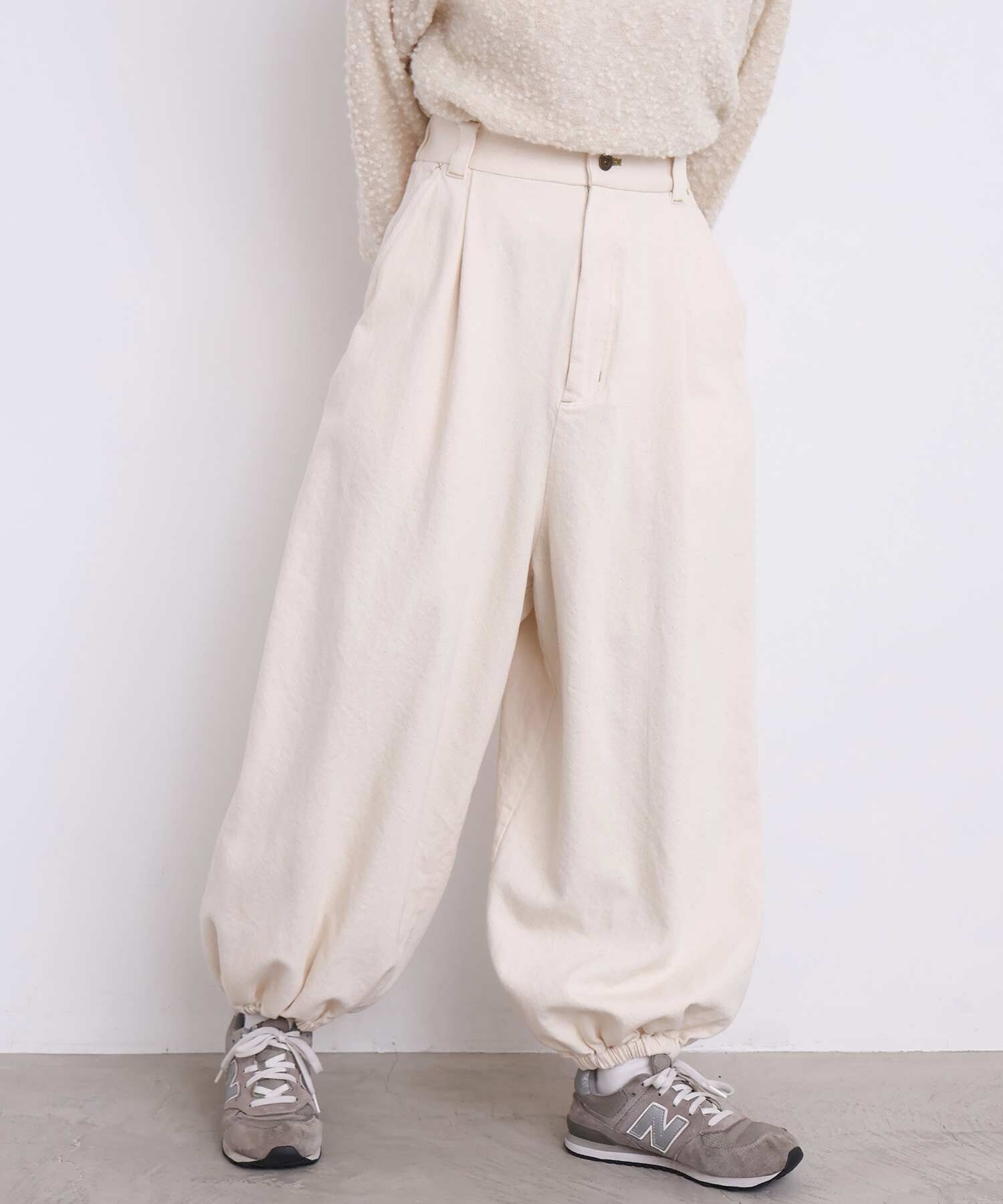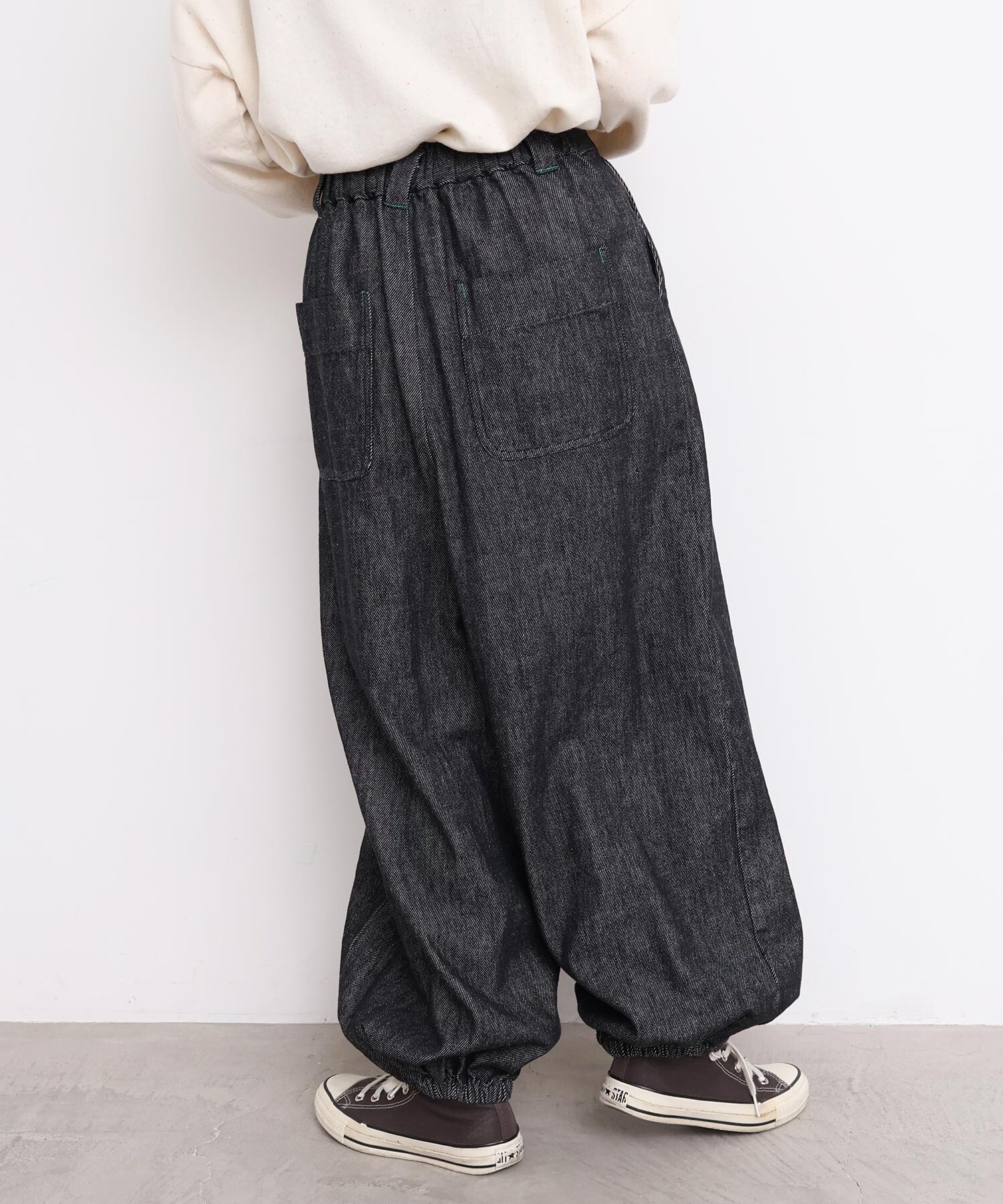 丸みのある裾しぼりやウエストの後ろゴム仕様。