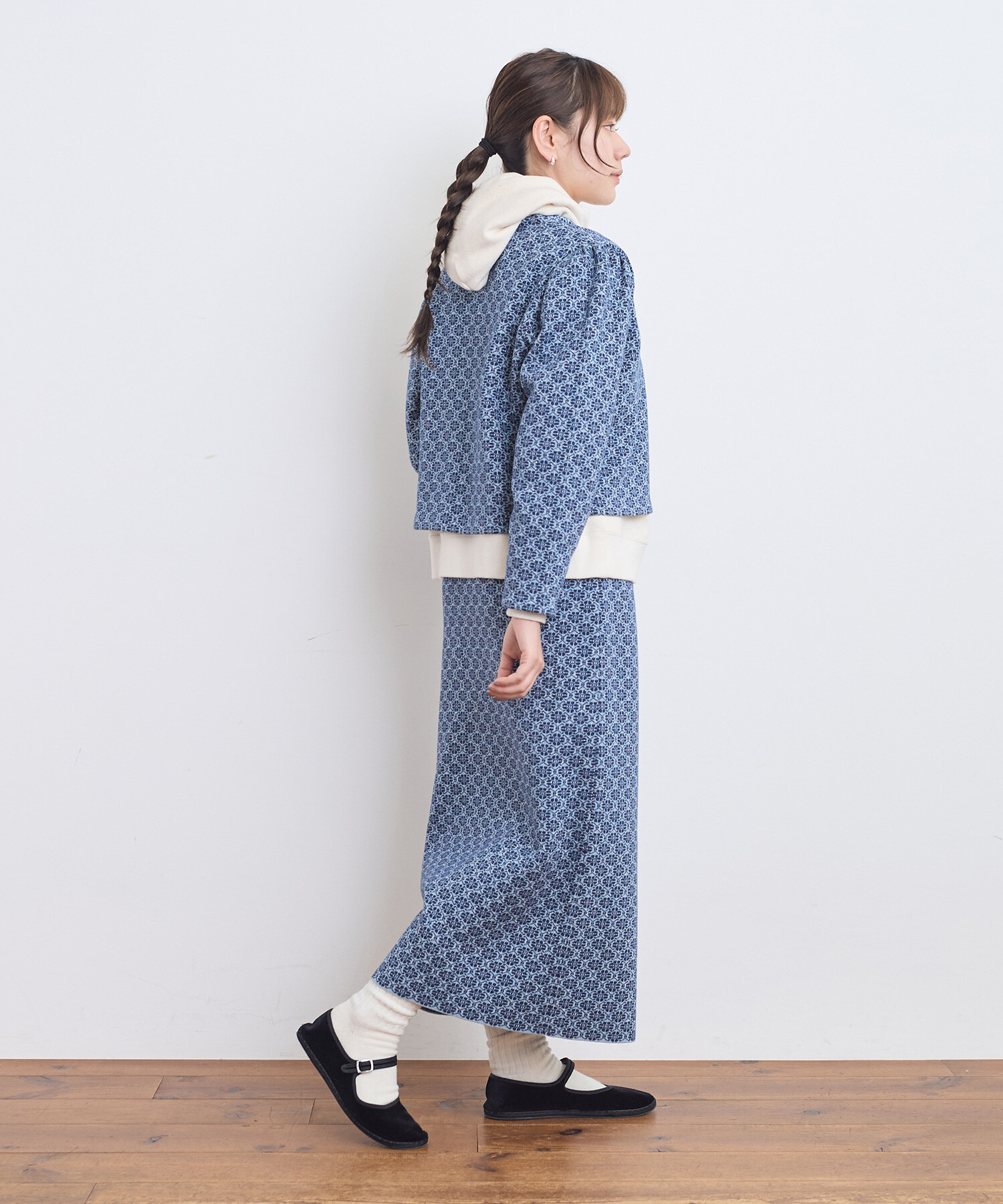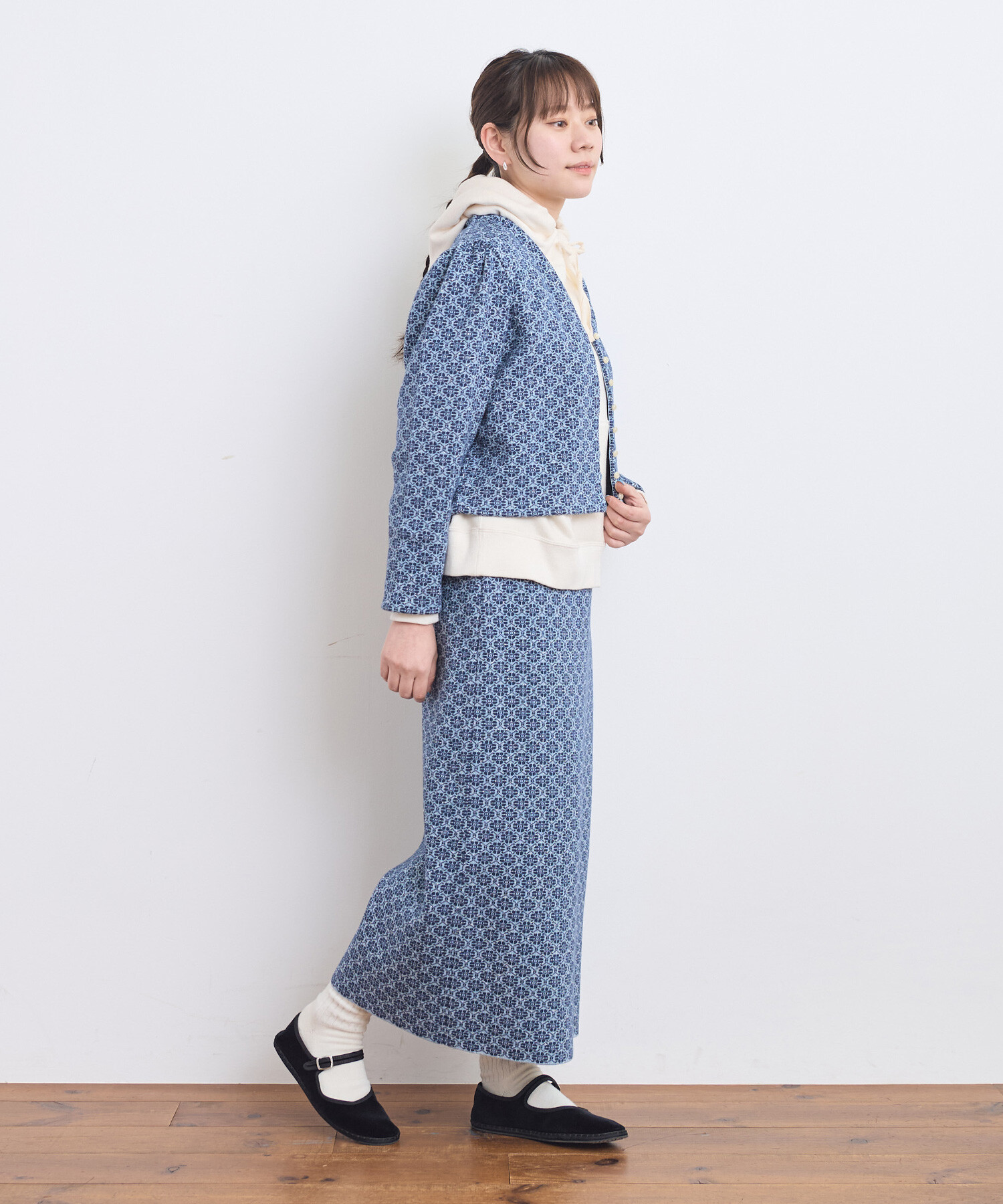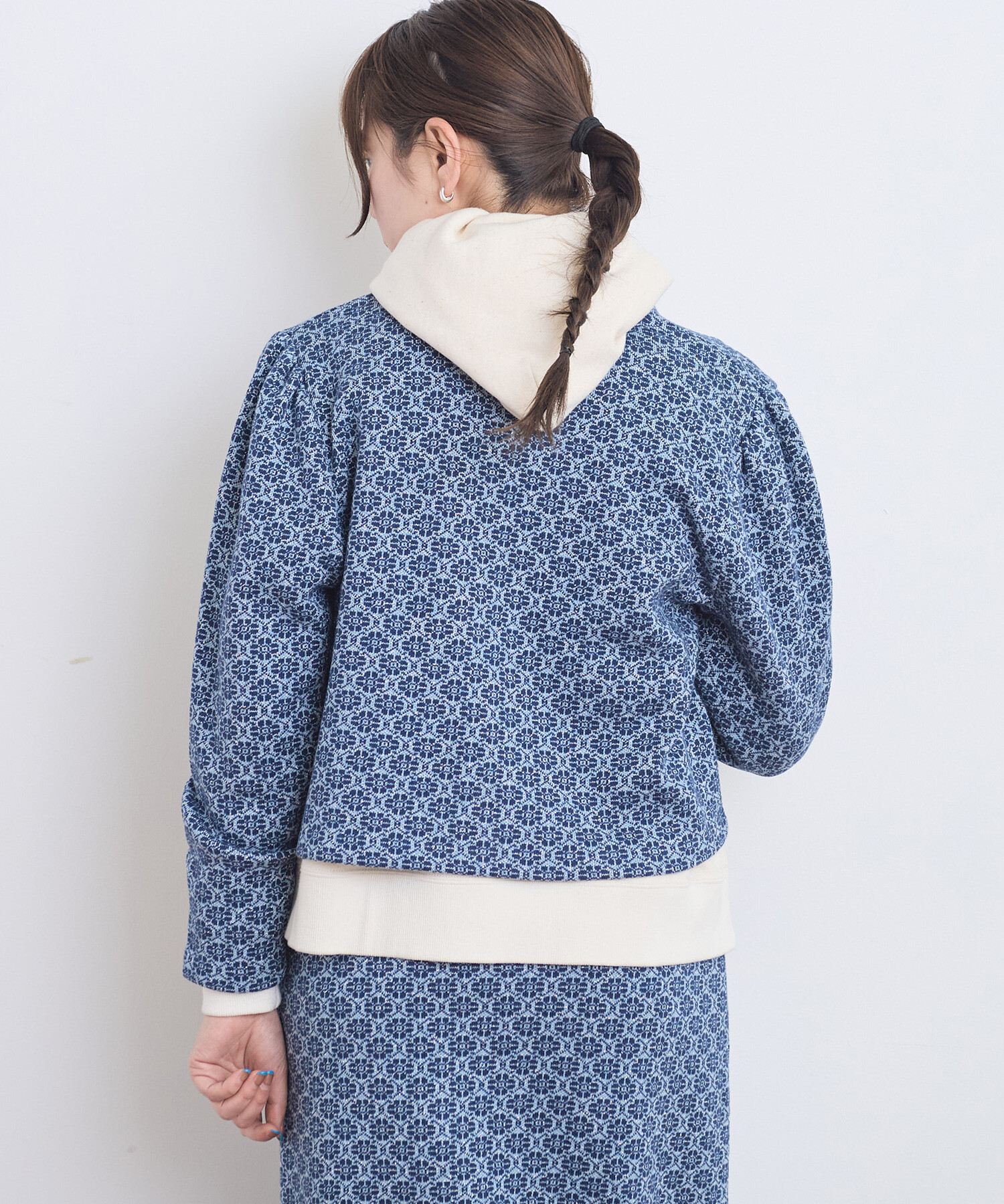 フラワーモチーフの幾何学模様をダブルジャカードで編み立て、